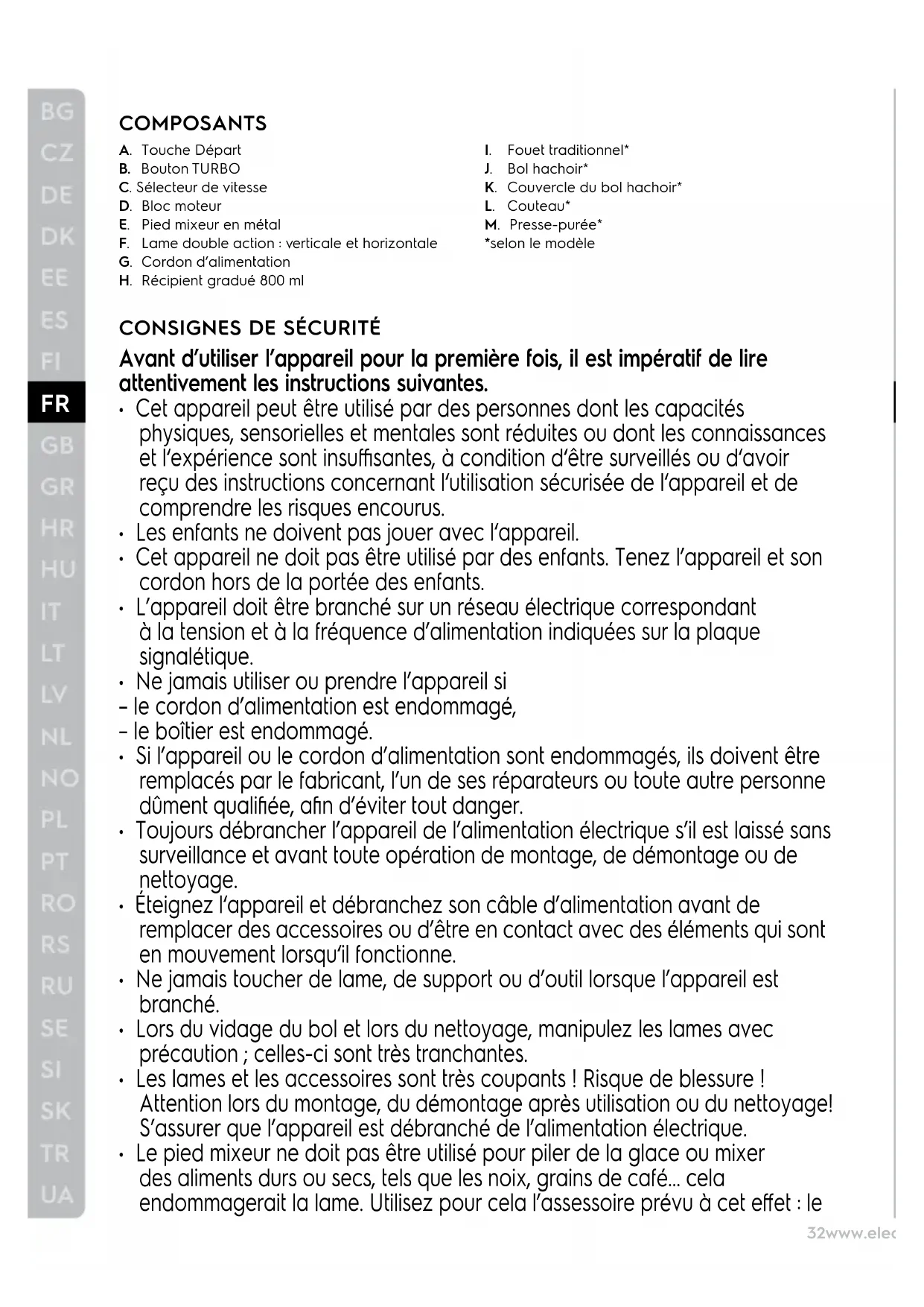 COMPOSANTS A. Touche Départ B. Bouton TURBO C. Sélecteur de vitesse D. Bloc moteur E. Pied mixeur en métal F. Lame double action : verticale et horizontale G. Cordon d’alimentation H. Récipient gradué 800 ml