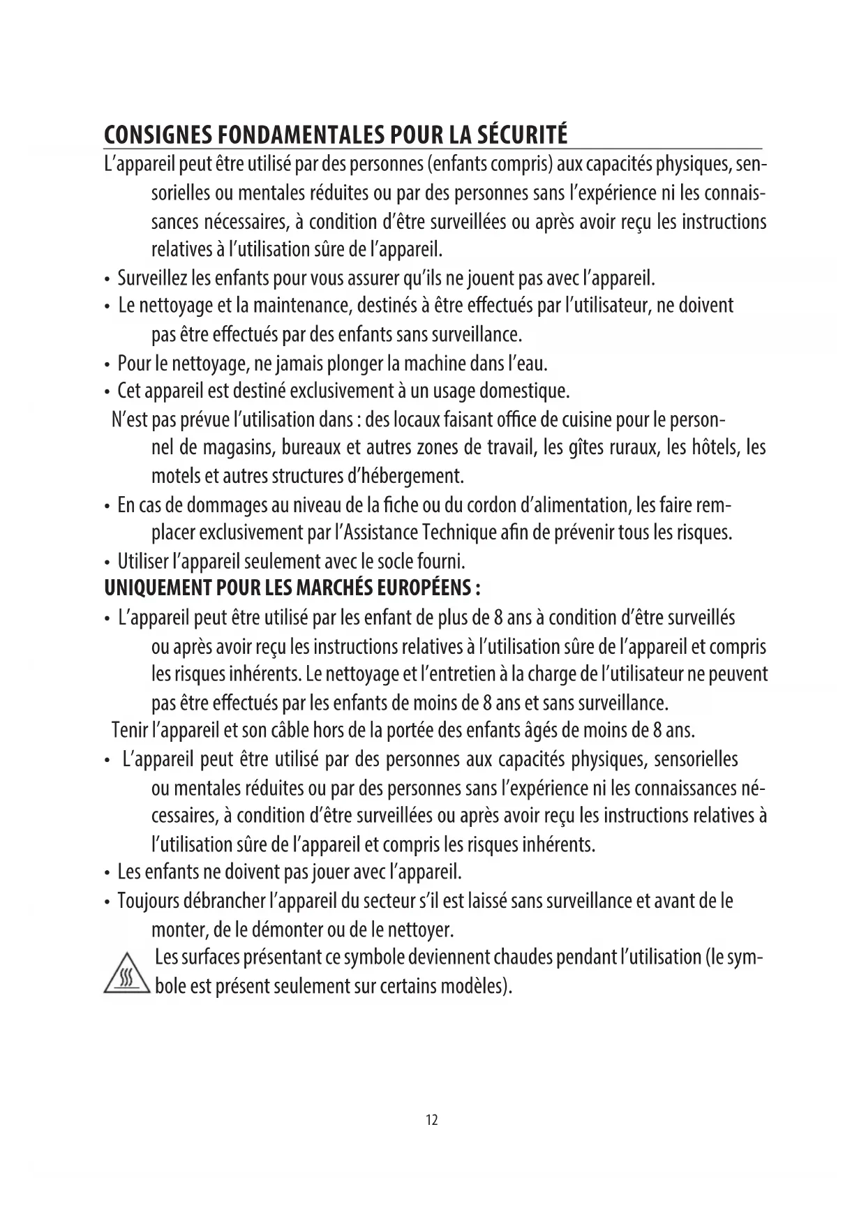 - Pendant l’utilisation ne touchez pas les surfaces chaudes de l’appareil. Utilisez les touches ou les poignées.