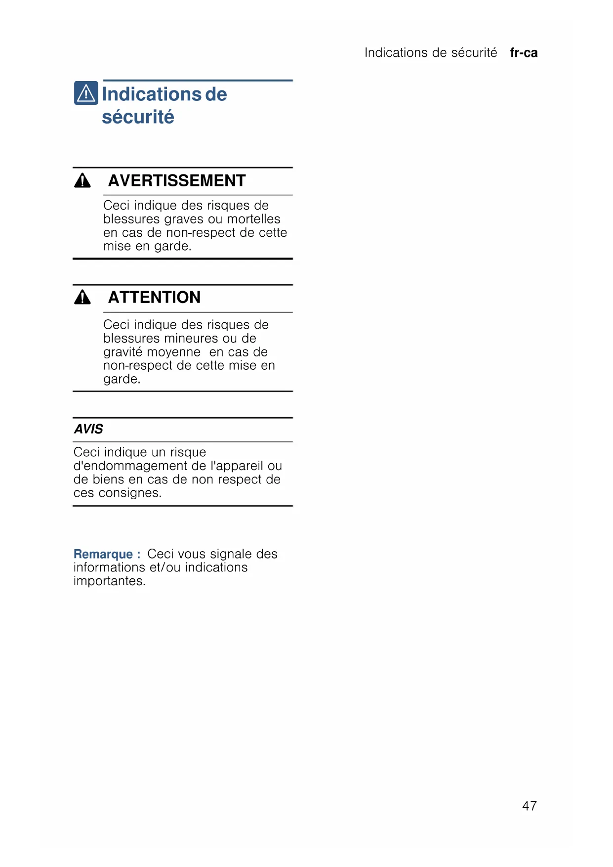 Table des matières fr-ca Notice d'utilisation ( Indications de sécurité ...47