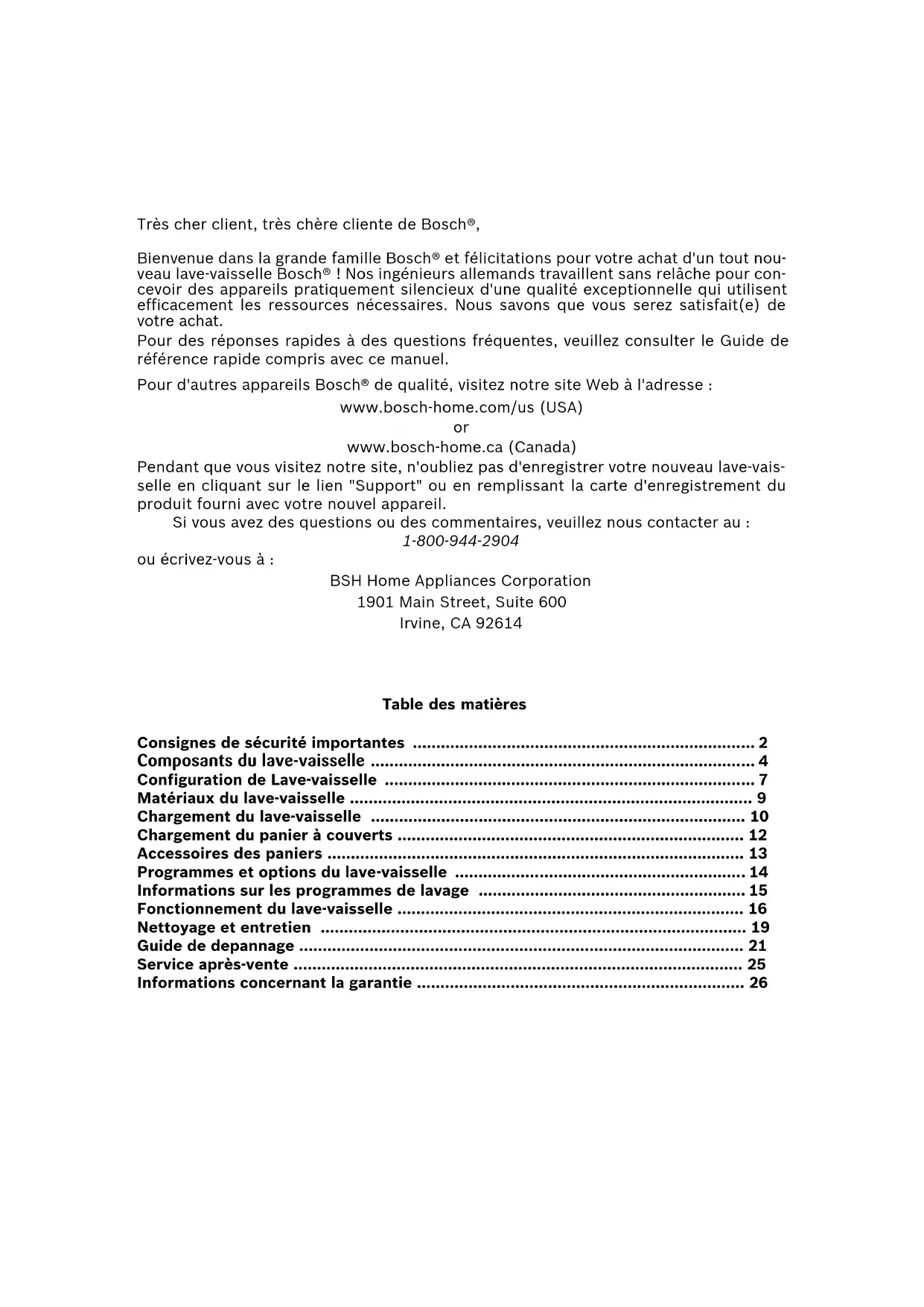 - www.bosch-home.ca (Canada) Pendant que vous visitez notre site, n'oubliez pas d'enregistrer votre nouveau lave-vais- selle en cliquant sur le lien "Support" ou en remplissant la carte d'enregistrement du produit fourni avec votre nouvel appareil. Si vous avez des questions ou des commentaires, veuillez nous contacter au : 1-800-944-2904 ou écrivez-vous à : BSH Home Appliances Corporation 1901 Main Street, Suite 600 Irvine, CA 92614 Table des matières Consignes de sécurité importantes p. 2