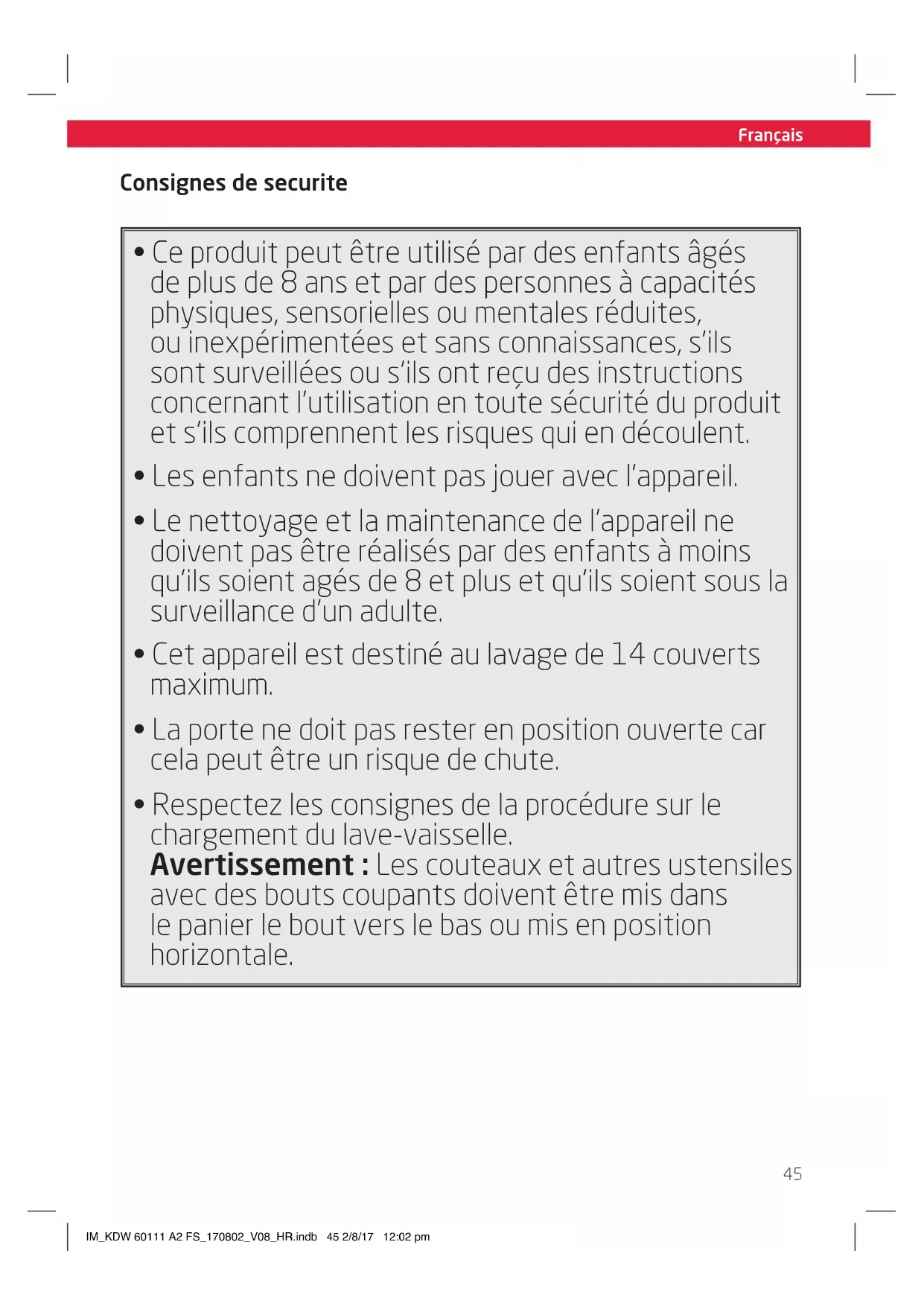 avec des bouts coupants doivent être mis dans le panier le bout vers le bas ou mis en position horizontale. IM_KDW 60111 A2 FS_170802_V08_HR.indb 45 2/8/17 12:02 pmFrançais