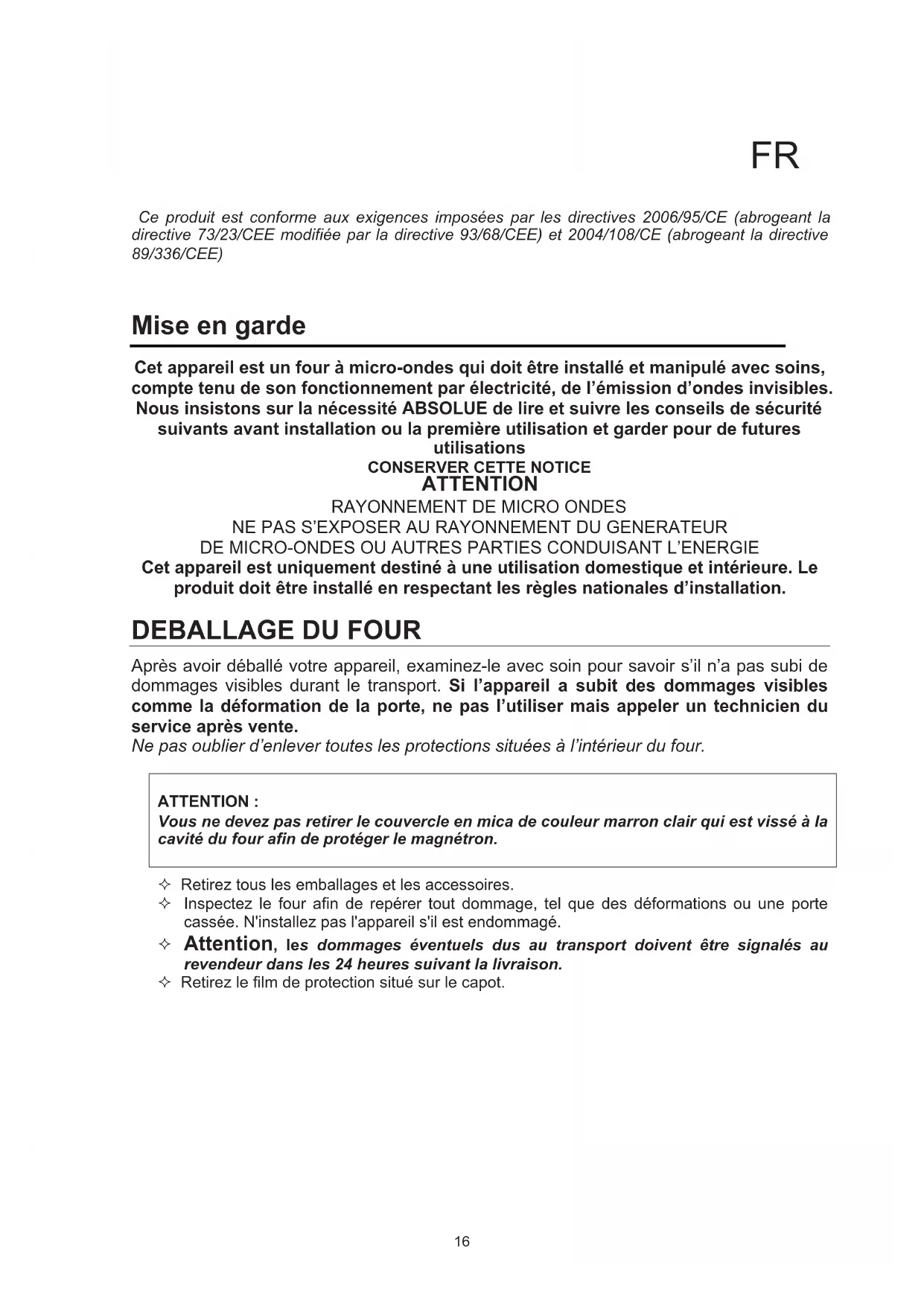 15Ce produit est conforme aux exigences imposées par les directives 2006/95/CE (abrogeant la directive 73/23/CEE modifiée par la directive 93/68/CEE) et 2004/108/CE (abrogeant la directive 89/336/CEE) Mise en garde Cet appareil est un four à micro-ondes qui doit être installé et manipulé avec soins, compte tenu de son fonctionnement par électricité, de l’émission d’ondes invisibles. Nous insistons sur la nécessité ABSOLUE de lire et suivre les conseils de sécurité suivants avant installation ou la première utilisation et garder pour de futures utilisations