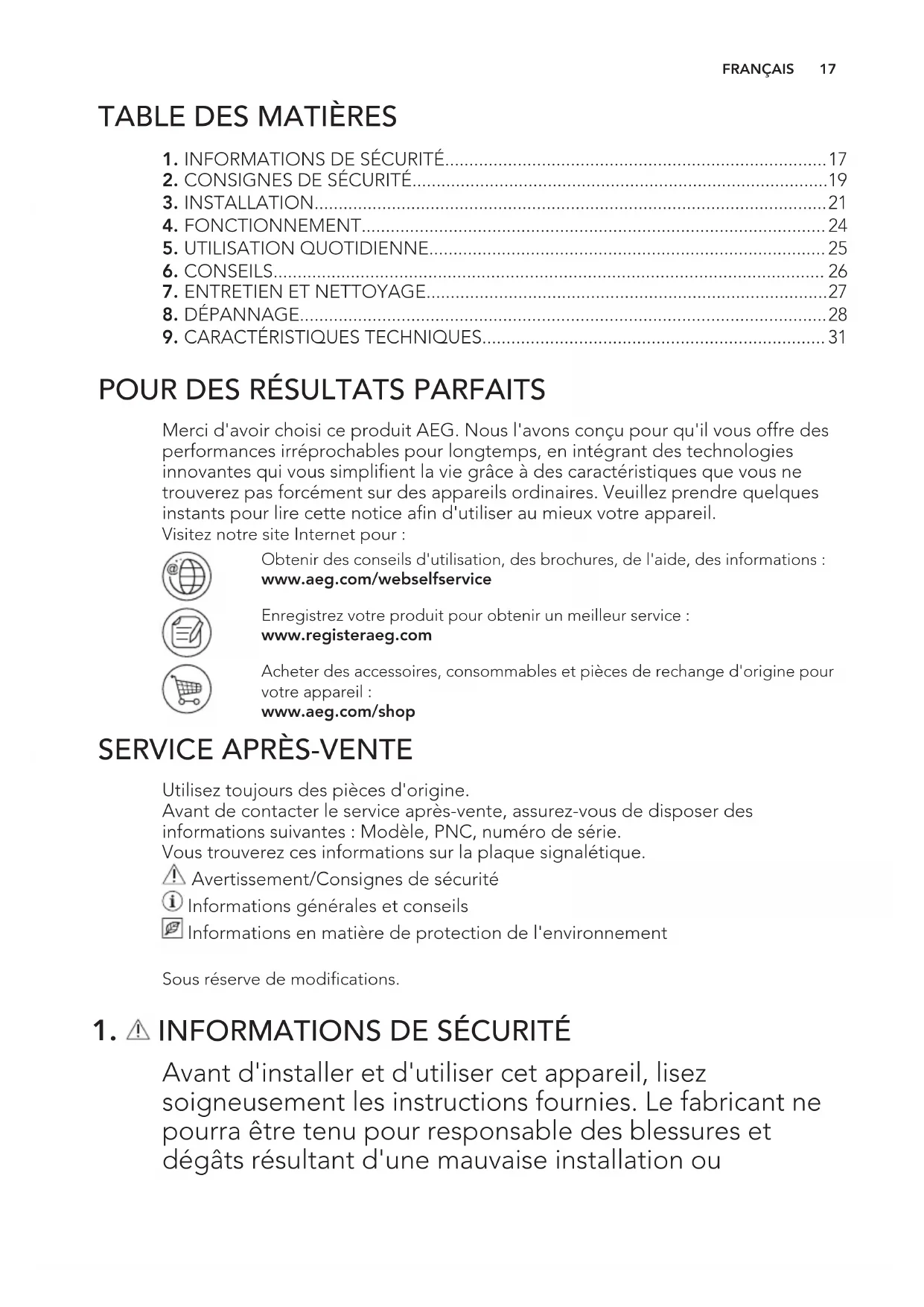 Merci d'avoir choisi ce produit AEG. Nous l'avons conçu pour qu'il vous offre des performances irréprochables pour longtemps, en intégrant des technologies innovantes qui vous simplifient la vie grâce à des caractéristiques que vous ne trouverez pas forcément sur des appareils ordinaires. Veuillez prendre quelques instants pour lire cette notice afin d'utiliser au mieux votre appareil. Visitez notre site Internet pour : Obtenir des conseils d'utilisation, des brochures, de l'aide, des informations : www.aeg.com/webselfservice Enregistrez votre produit pour obtenir un meilleur service : www.registeraeg.com Acheter des accessoires, consommables et pièces de rechange d'origine pour votre appareil : www.aeg.com/shop