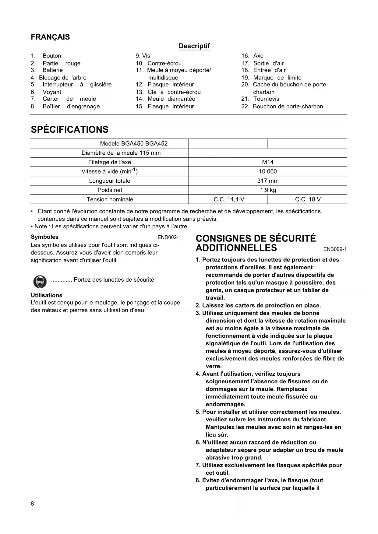 - Note : Les spécifications peuvent varier d'un pays à l'autre. Symboles END002-1 Les symboles utilisés pour l'outil sont indiqués ci- dessous. Assurez-vous d'avoir bien compris leur signification avant d'utiliser l'outil. ............. Portez des lunettes de sécurité. Utilisations L'outil est conçu pour le meulage, le ponçage et la coupe des métaux et pierres sans utilisation d'eau.