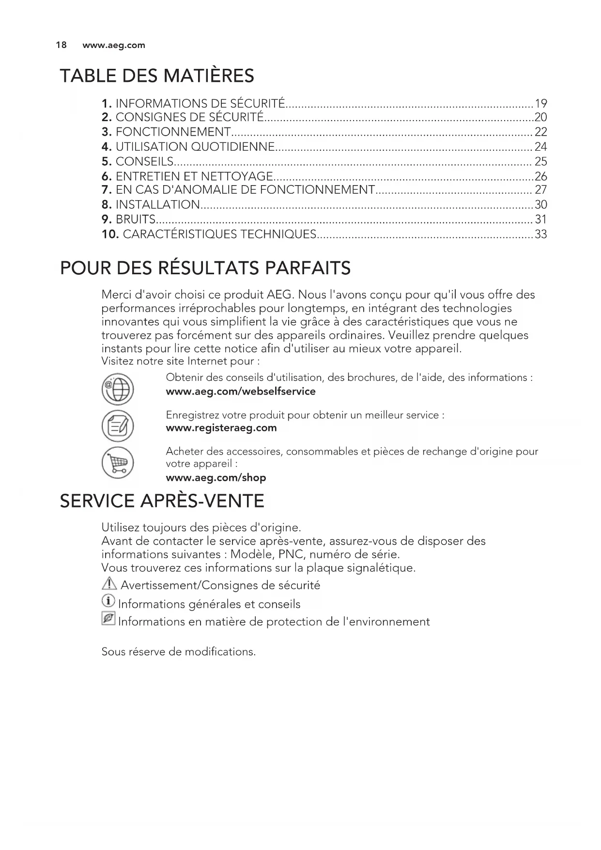 Merci d'avoir choisi ce produit AEG. Nous l'avons conçu pour qu'il vous offre des performances irréprochables pour longtemps, en intégrant des technologies innovantes qui vous simplifient la vie grâce à des caractéristiques que vous ne trouverez pas forcément sur des appareils ordinaires. Veuillez prendre quelques instants pour lire cette notice afin d'utiliser au mieux votre appareil. Visitez notre site Internet pour : Obtenir des conseils d'utilisation, des brochures, de l'aide, des informations : www.aeg.com/webselfservice Enregistrez votre produit pour obtenir un meilleur service : www.registeraeg.com Acheter des accessoires, consommables et pièces de rechange d'origine pour votre appareil : www.aeg.com/shop