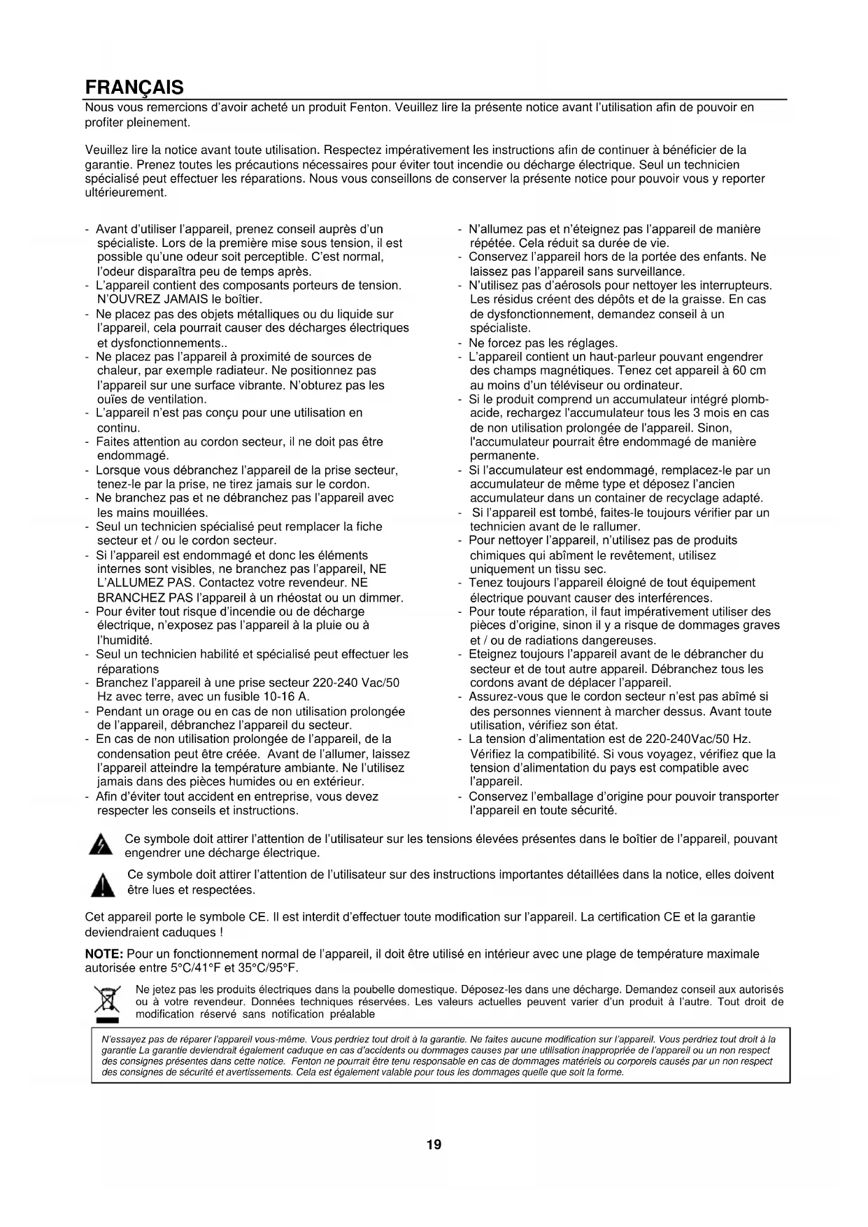 Belgium (BE), Denmark (DK), France (F), Finland (FI), Germany (DE), Hungary (HU), Italy (IT), Netherlands (NL), Norway (NO), Poland (PL), Portugal (PT), Romania (RO), Slovenia (SI), Spain (ES), Sweden (SE), Switzerland (CH), Great Britain (GB).19 FRANÇAIS Nous vous remercions d’avoir acheté un produit Fenton. Veuillez lire la présente notice avant l’utilisation afin de pouvoir en profiter pleinement. Veuillez lire la notice avant toute utilisation. Respectez impérativement les instructions afin de continuer à bénéficier de la garantie. Prenez toutes les précautions nécessaires pour éviter tout incendie ou décharge électrique. Seul un technicien spécialisé peut effectuer les réparations. Nous vous conseillons de conserver la présente notice pour pouvoir vous y reporter ultérieurement.