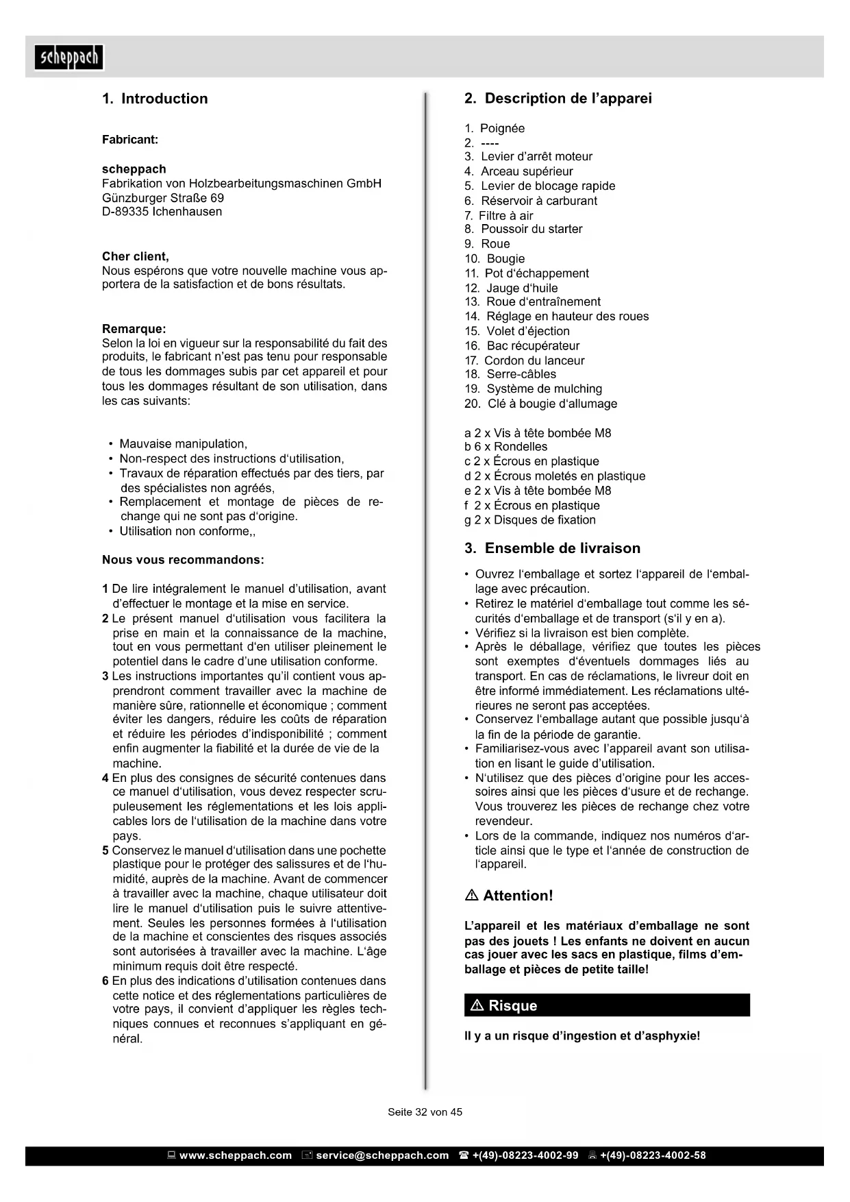 - Lors de la commande, indiquez nos numéros d‘ar- ticle ainsi que le type et l‘année de construction de l‘appareil. m Attention! L’appareil et les matériaux d’emballage ne sont pas des jouets ! Les enfants ne doivent en aucun cas jouer avec les sacs en plastique, lms d’em- ballage et pièces de petite taille! m Risque Il y a un risque d’ingestion et d’asphyxie!Seite 33 von 45 www.scheppach.com service@scheppach.com +(49)-08223-4002-99 +(49)-08223-4002-58 www.scheppach.com service@scheppach.com +(49)-08223-4002-99 +(49)-08223-4002-58