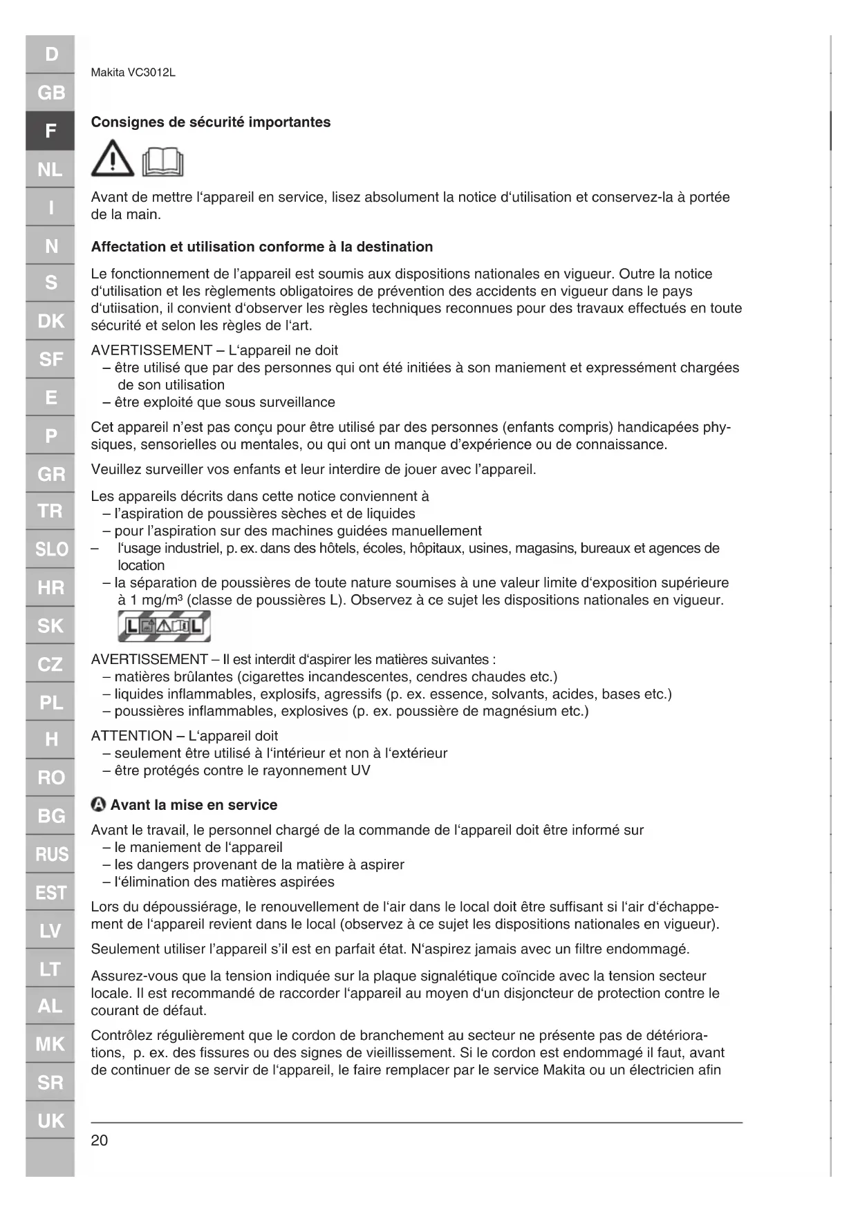 Makita VC3012L Consignes de sécurité importantes Avant de mettre l‘appareil en service, lisez absolument la notice d‘utilisation et conservez-la à portée de la main. Affectation et utilisation conforme à la destination Le fonctionnement de l’appareil est soumis aux dispositions nationales en vigueur. Outre la notice d‘utilisation et les règlements obligatoires de prévention des accidents en vigueur dans le pays d‘utiisation, il convient d‘observer les règles techniques reconnues pour des travaux effectués en toute sécurité et selon les règles de l‘art. AVERTISSEMENT – L‘appareil ne doit – être utilisé que par des personnes qui ont été initiées à son maniement et expressément chargées de son utilisation – être exploité que sous surveillance Cet appareil n’est pas conçu pour être utilisé par des personnes (enfants compris) handicapées phy- siques, sensorielles ou mentales, ou qui ont un manque d’expérience ou de connaissance. Veuillez surveiller vos enfants et leur interdire de jouer avec l’appareil. Les appareils décrits dans cette notice conviennent à – l’aspiration de poussières sèches et de liquides – pour l’aspiration sur des machines guidées manuellement – l‘usage industriel, p. ex. dans des hôtels, écoles, hôpitaux, usines, magasins, bureaux et agences de location – la séparation de poussières de toute nature soumises à une valeur limite d‘exposition supérieure à 1 mg/m³ (classe de poussières L). Observez à ce sujet les dispositions nationales en vigueur. AVERTISSEMENT – Il est interdit d‘aspirer les matières suivantes : – matières brûlantes (cigarettes incandescentes, cendres chaudes etc.) – liquides inflammables, explosifs, agressifs (p. ex. essence, solvants, acides, bases etc.) – poussières inflammables, explosives (p. ex. poussière de magnésium etc.) ATTENTION – L‘appareil doit – seulement être utilisé à l‘intérieur et non à l‘extérieur – être protégés contre le rayonnement UV Avant la mise en service Avant le travail, le personnel chargé de la commande de l‘appareil doit être informé sur – le maniement de l‘appareil – les dangers provenant de la matière à aspirer – l‘élimination des matières aspirées Lors du dépoussiérage, le renouvellement de l‘air dans le local doit être suffisant si l‘air d‘échappe- ment de l‘appareil revient dans le local (observez à ce sujet les dispositions nationales en vigueur). Seulement utiliser l’appareil s’il est en parfait état. N‘aspirez jamais avec un filtre endommagé. Assurez-vous que la tension indiquée sur la plaque signalétique coïncide avec la tension secteur locale. Il est recommandé de raccorder l‘appareil au moyen d‘un disjoncteur de protection contre le courant de défaut. Contrôlez régulièrement que le cordon de branchement au secteur ne présente pas de détériora- tions, p. ex. des fissures ou des signes de vieillissement. Si le cordon est endommagé il faut, avant de continuer de se servir de l‘appareil, le faire remplacer par le service Makita ou un électricien afinD