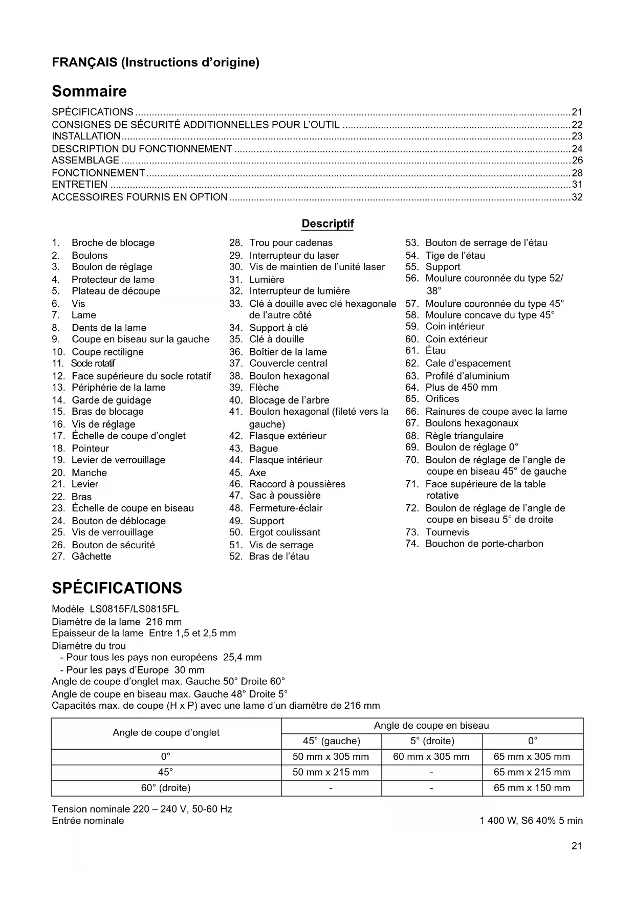 Angle de coupe d’onglet Angle de coupe en biseau 45° (gauche) 5° (droite) 0° 0° 50 mm x 305 mm 60 mm x 305 mm 65 mm x 305 mm 45° 50 mm x 215 mm - 65 mm x 215 mm 60° (droite) - - 65 mm x 150 mm22 Vitesse à vide (min