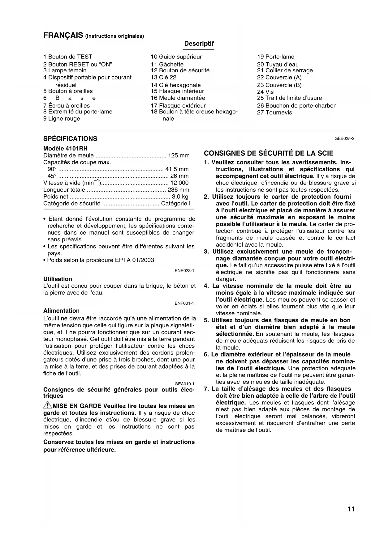 - Poids selon la procédure EPTA 01/2003 ENE023-1 Utilisation L’outil est conçu pour couper dans la brique, le béton et la pierre avec de l’eau. ENF001-1 Alimentation L’outil ne devra être raccordé qu’à une alimentation de la même tension que celle qui figure sur la plaque signaléti- que, et il ne pourra fonctionner que sur un courant sec- teur monophasé. Cet outil doit être mis à la terre pendant l’utilisation pour protéger l’utilisateur contre les chocs électriques. Utilisez exclusivement des cordons prolon- gateurs dotés d’une prise à trois broches, dont une pour la mise à la terre, et des prises de courant adaptées à la fiche de l’outil. GEA010-1 Consignes de sécurité générales pour outils élec- triques MISE EN GARDE Veuillez lire toutes les mises en garde et toutes les instructions. Il y a risque de choc électrique, d’incendie et/ou de blessure grave si les mises en garde et les instructions ne sont pas respectées. Conservez toutes les mises en garde et instructions pour référence ultérieure. GEB025-2 CONSIGNES DE SÉCURITÉ DE LA SCIE