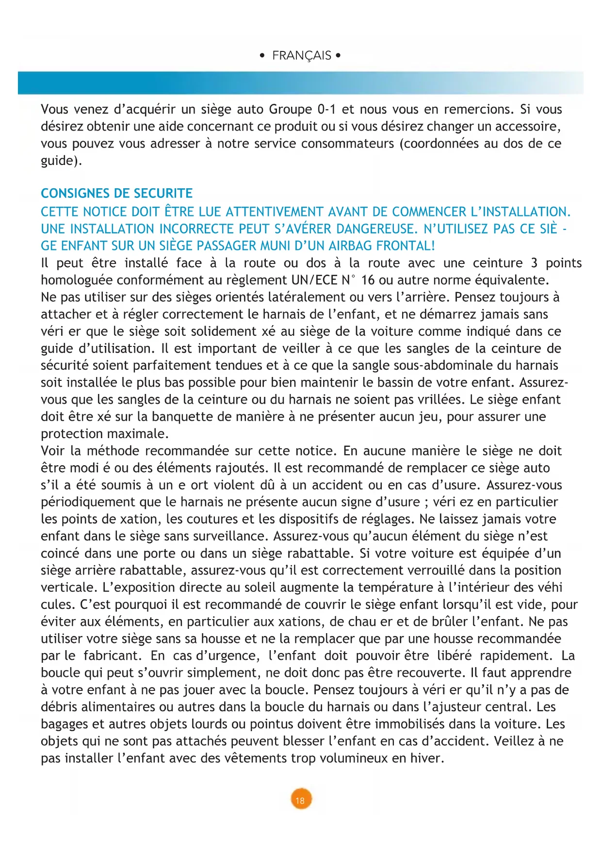 CETTE NOTICE DOIT ÊTRE LUE ATTENTIVEMENT AVANT DE COMMENCER L’INSTALLATION. UNE INSTALLATION INCORRECTE PEUT S’AVÉRER DANGEREUSE. N’UTILISEZ PAS CE SIÈ - GE ENFANT SUR UN SIÈGE PASSAGER MUNI D’UN AIRBAG FRONTAL! Il peut être installé face à la route ou dos à la route avec une ceinture 3 points homologuée conformément au règlement UN/ECE N° 16 ou autre norme équivalente. Ne pas utiliser sur des sièges orientés latéralement ou vers l’arrière. Pensez toujours à attacher et à régler correctement le harnais de l’enfant, et ne démarrez jamais sans véri er que le siège soit solidement xé au siège de la voiture comme indiqué dans ce guide d’utilisation. Il est important de veiller à ce que les sangles de la ceinture de sécurité soient parfaitement tendues et à ce que la sangle sous-abdominale du harnais soit installée le plus bas possible pour bien maintenir le bassin de votre enfant. Assurez- vous que les sangles de la ceinture ou du harnais ne soient pas vrillées. Le siège enfant doit être xé sur la banquette de manière à ne présenter aucun jeu, pour assurer une protection maximale. Voir la méthode recommandée sur cette notice. En aucune manière le siège ne doit être modi é ou des éléments rajoutés. Il est recommandé de remplacer ce siège auto s’il a été soumis à un e ort violent dû à un accident ou en cas d’usure. Assurez-vous périodiquement que le harnais ne présente aucun signe d’usure ; véri ez en particulier les points de xation, les coutures et les dispositifs de réglages. Ne laissez jamais votre enfant dans le siège sans surveillance. Assurez-vous qu’aucun élément du siège n’est coincé dans une porte ou dans un siège rabattable. Si votre voiture est équipée d’un siège arrière rabattable, assurez-vous qu’il est correctement verrouillé dans la position verticale. L’exposition directe au soleil augmente la température à l’intérieur des véhi cules. C’est pourquoi il est recommandé de couvrir le siège enfant lorsqu’il est vide, pour éviter aux éléments, en particulier aux xations, de chau er et de brûler l’enfant. Ne pas utiliser votre siège sans sa housse et ne la remplacer que par une housse recommandée par le fabricant. En cas d’urgence, l’enfant doit pouvoir être libéré rapidement. La boucle qui peut s’ouvrir simplement, ne doit donc pas être recouverte. Il faut apprendre à votre enfant à ne pas jouer avec la boucle. Pensez toujours à véri er qu’il n’y a pas de débris alimentaires ou autres dans la boucle du harnais ou dans l’ajusteur central. Les bagages et autres objets lourds ou pointus doivent être immobilisés dans la voiture. Les objets qui ne sont pas attachés peuvent blesser l’enfant en cas d’accident. Veillez à ne pas installer l’enfant avec des vêtements trop volumineux en hiver.• FRANÇAIS •
