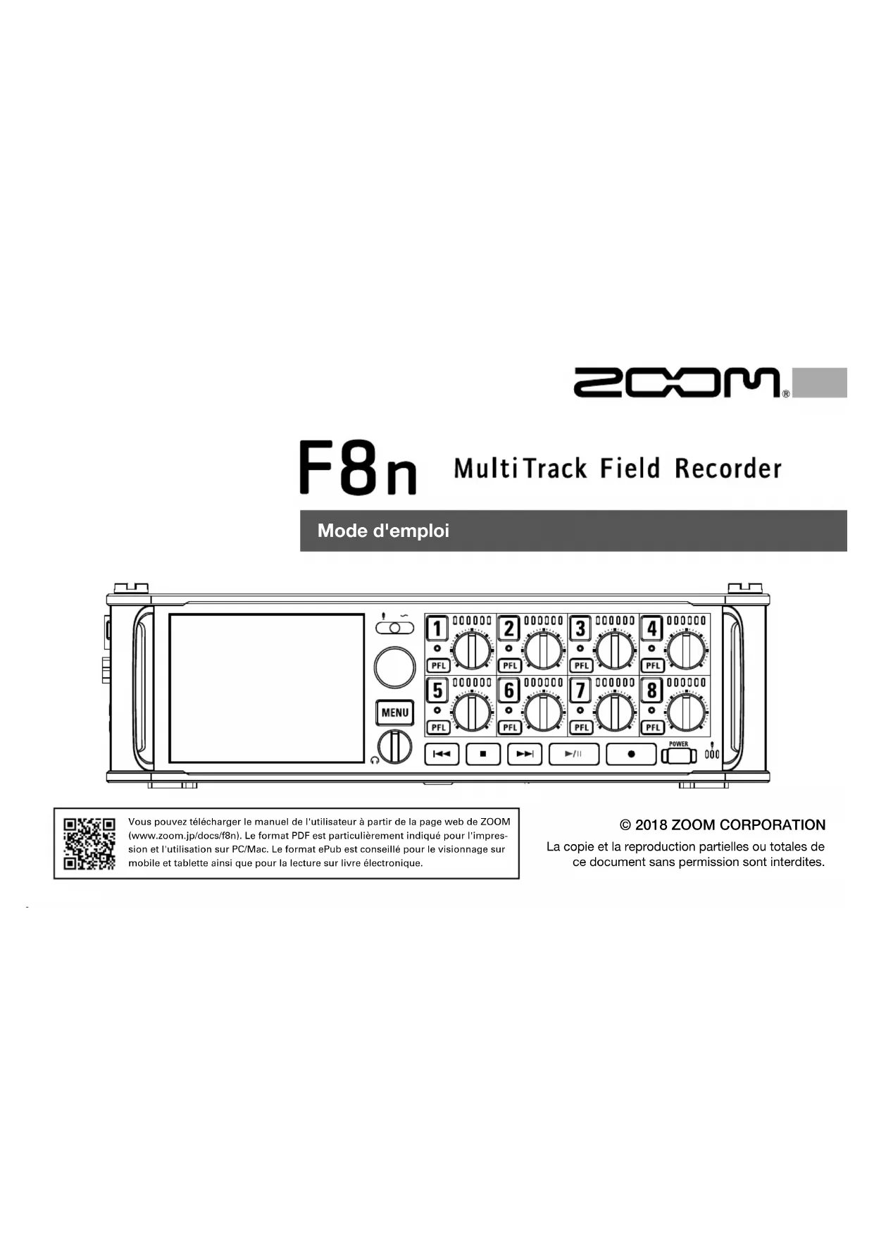 © 2018 ZOOM CORPORATION La copie et la reproduction partielles ou totales de ce document sans permission sont interdites. Mode d'emploi Vous pouvez télécharger le manuel de l'utilisateur à partir de la page web de ZOOM (www.zoom.jp/docs/f8n). Le format PDF est particulièrement indiqué pour l'impres- sion et l'utilisation sur PC/Mac. Le format ePub est conseillé pour le visionnage sur mobile et tablette ainsi que pour la lecture sur livre électronique.Sommaire