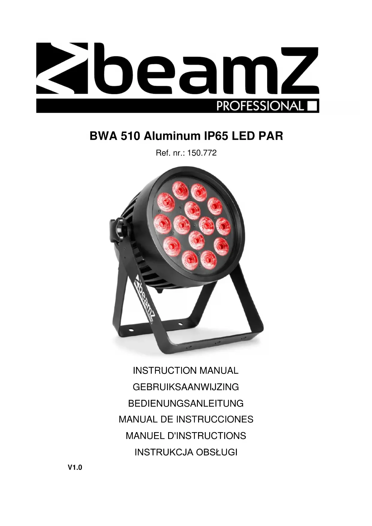 ATENCIÓN: Se recomienda encarecidamente que la limpieza interna sea llevada a cabo por trabajador cualificado!19 FRANÇAIS Nous vous remercions d’avoir acheté un appareil Beamz. Veuillez lire la présente notice avant l’utilisation afin de pouvoir en profiter pleinement. Veuillez lire la notice avant utilisation. Respectez impérativement les instructions afin de continuer à bénéficier de la garantie. Prenez toutes les précautions nécessaires pour éviter tout incendie ou décharge électrique. Seul un technicien spécialisé peut effectuer les réparations. Nous vous conseillons de conserver la présente notice pour pouvoir vous y reporter ultérieurement. - Avant d’utiliser l’appareil, prenez conseil auprès d’un spécialiste. Lors de la première mise sous tension, il est possible qu’une odeur soit perceptible. C’est normal, l’odeur disparaîtra peu de temps après. - L’appareil contient des composants porteurs de tension. N’OUVREZ JAMAIS le boîtier. - Ne placez pas des objets métalliques ou du liquide sur l’appareil, cela pourrait causer des décharges électriques et dysfonctionnements. - Ne placez pas l’appareil à proximité de sources de chaleur, par exemple radiateur. Ne positionnez pas l’appareil sur une surface vibrante. N’obturez pas les ouïes de ventilation. - L’appareil n’est pas conçu pour une utilisation en continu. - Faites attention au cordon secteur, il ne doit pas être endommagé. - Lorsque vous débranchez l’appareil de la prise secteur, tenez-le par la prise, ne tirez jamais sur le cordon. - Ne branchez pas et ne débranchez pas l’appareil avec les mains mouillées. - Seul un technicien spécialisé peut remplacer la fiche secteur et / ou le cordon secteur. - Si l’appareil est endommagé et donc les éléments internes sont visibles, ne branchez pas l’appareil, NE L’ALLUMEZ PAS. Contactez votre revendeur. NE BRANCHEZ PAS l’appareil à un rhéostat ou un dimmer. - Pour éviter tout risque d’incendie ou de décharge électrique, n’exposez pas l’appareil à la pluie ou à l’humidité. - Seul un technicien habilité et spécialisé peut effectuer les réparations - Branchez l’appareil à une prise 220-240 V/50 Hz avec terre, avec un fusible 10-16 A. - Pendant un orage ou en cas de non utilisation prolongée de l’appareil, débranchez l’appareil du secteur. - En cas de non utilisation prolongée de l’appareil, de la condensation peut être créée. Avant de l’allumer, laissez l’appareil atteindre la température ambiante. Ne l’utilisez jamais dans des pièces humides ou en extérieur. - Pendant le fonctionnement, le boîtier est très chaud. - Ne le touchez pas pendant le fonctionnement et juste après. - Afin d’éviter tout accident en entreprise, vous devez respecter les conseils et instructions. - Assurez l’appareil avec une élingue de sécurité s’il doit être monté au plafond. Utilisez un système de crochets. Assurez- vous que personne ne puisse se trouver sous l’appareil. Il doit être monté à 50 cm au moins de tout matériau inflammable et à un mètre au moins de toute surface pour garantir son bon refroidissement. - Cet appareil contient des LEDs de grande intensité. Ne regardez pas directement les LEDs pour éviter tout troubles de la vision. - N’allumez pas et n’éteignez pas l’appareil de manière répétée. Cela réduit sa durée de vie. - Conservez l’appareil hors de la portée des enfants. Ne laissez pas l’appareil sans surveillance. - N’utilisez pas d’aérosols pour nettoyer les interrupteurs. Les résidus créent des dépôts et de la graisse. En cas de dysfonctionnement, demandez conseil à un spécialiste. - Ayez toujours les mains propres pour utiliser l’appareil. - Ne forcez pas les réglages. - Si l’appareil est tombé, faites-le toujours vérifier par un technicien avant de le rallumer. - Pour nettoyer l’appareil, n’utilisez pas de produits chimiques qui abîment le revêtement, utilisez uniquement un tissu sec. - Tenez toujours l’appareil éloigné de tout équipement électrique pouvant causer des interférences. - Pour toute réparation, il faut impérativement utiliser des pièces d’origine, sinon il y a risque de dommages graves et / ou de radiations dangereuses. - Eteignez toujours l’appareil avant de le débrancher du secteur et de tout autre appareil. Débranchez tous les cordons avant de déplacer l’appareil. - Assurez-vous que le cordon secteur n’est pas abîmé si des personnes viennent à marcher dessus. Avant toute utilisation, vérifiez son état. - La tension d’alimentation est de 220-240 V~/50 Hz. Vérifiez la compatibilité. Si vous voyagez, vérifiez que la tension d’alimentation du pays est compatible avec l’appareil. - Conservez l’emballage d’origine pour pouvoir transporter l’appareil en toute sécurité. CE symbole doit attirer l’attention de l’utilisateur sur les tensions élevées présentes dans le boîtier de l’appareil, pouvant engendrer une décharge électrique. CE symbole doit attirer l’attention de l’utilisateur sur des instructions importantes détaillées dans la notice, elles doivent être lues et respectées. NE REGARDEZ PAS DIRECTEMENT LA LENTILLE. Cela peut créer des troubles de la vision. Les personnes photosensibles et épileptiques doivent prendre en compte les effets que ce jeu de lumière peut causer. Cet appareil porte le symbole CE. Il est interdit d’effectuer toute modification sur l’appareil. La certification CE et la garantie deviendraient caduques ! NOTE: Pour un fonctionnement normal de l’appareil, il doit être utilisé en intérieur avec une plage de température maximale autorisée entre 5°C/41°F et 35°C/95°F. Ne jetez pas les produits électriques dans la poubelle domestique. Déposez-les dans une déchetterie. Demandez conseil aux autorités locales ou à votre revendeur. Données spécifiques. Les valeurs actuelles peuvent légèrement va