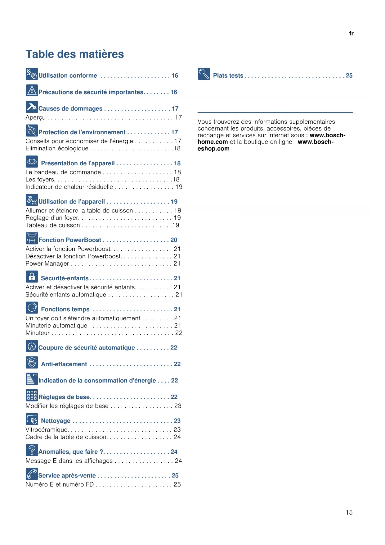 - Présentation de l'appareil . . . . . . . . . . . . . . . . . 18 Le bandeau de commande . . . . . . . . . . . . . . . . . . . . 18 Les foyers. . . . . . . . . . . . . . . . . . . . . . . . . . . . . . . . . .18 Indicateur de chaleur résiduelle . . . . . . . . . . . . . . . . . 19 1 Utilisation de l’appareil . . . . . . . . . . . . . . . . . . . 19 Allumer et éteindre la table de cuisson . . . . . . . . . . . 19 Réglage d'un foyer. . . . . . . . . . . . . . . . . . . . . . . . . . . 19 Tableau de cuisson . . . . . . . . . . . . . . . . . . . . . . . . . .19 v Fonction PowerBoost . . . . . . . . . . . . . . . . . . . . 20 Activer la fonction Powerboost. . . . . . . . . . . . . . . . . . 21 Désactiver la fonction Powerboost. . . . . . . . . . . . . . . 21 Power-Manager . . . . . . . . . . . . . . . . . . . . . . . . . . . . . 21 A Sécurité-enfants. . . . . . . . . . . . . . . . . . . . . . . . . 21 Activer et désactiver la sécurité enfants. . . . . . . . . . . 21 Sécuritéenfants automatique . . . . . . . . . . . . . . . . . . . 21 O Fonctions temps . . . . . . . . . . . . . . . . . . . . . . . . 21 Un foyer doit s'éteindre automatiquement . . . . . . . . . 21 Minuterie automatique . . . . . . . . . . . . . . . . . . . . . . . . 21 Minuteur . . . . . . . . . . . . . . . . . . . . . . . . . . . . . . . . . . . 22 b Coupure de sécurité automatique . . . . . . . . . . 22 k Anti-effacement . . . . . . . . . . . . . . . . . . . . . . . . . 22 [ Indication de la consommation d'énergie . . . . 22 Q Réglages de base. . . . . . . . . . . . . . . . . . . . . . . . 22 Modifier les réglages de base . . . . . . . . . . . . . . . . . . 23 D Nettoyage . . . . . . . . . . . . . . . . . . . . . . . . . . . . . . 23 Vitrocéramique. . . . . . . . . . . . . . . . . . . . . . . . . . . . . . 23 Cadre de la table de cuisson. . . . . . . . . . . . . . . . . . . 24 3 Anomalies, que faire ?. . . . . . . . . . . . . . . . . . . . 24 Message E dans les affichages . . . . . . . . . . . . . . . . . 24 4 Service après-vente . . . . . . . . . . . . . . . . . . . . . . 25 Numéro E et numéro FD . . . . . . . . . . . . . . . . . . . . . . 25 E Plats tests . . . . . . . . . . . . . . . . . . . . . . . . . . . . . . 25 Produktinfo Vous trouverez des informations supplementaires concernant les produits, accessoires, pièces de rechange et services sur Internet sous : www.bosch- home.com et la boutique en ligne : www.bosch- eshop.comfr Utilisation conforme
