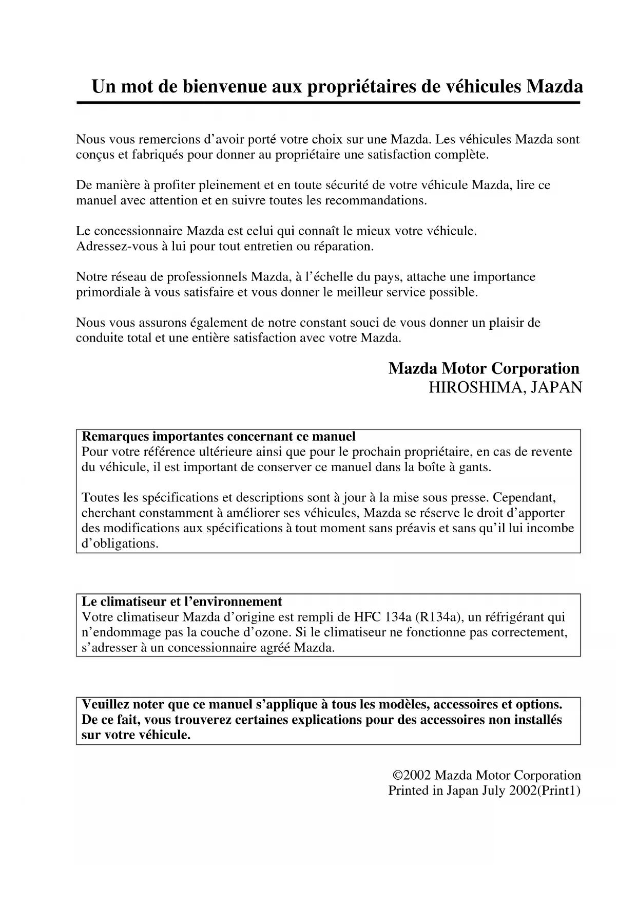 Un mot de bienvenue aux propriétaires de véhicules Mazda Form No. 8R10-EC-02G-F Nous vous remercions d’avoir porté votre choix sur une Mazda. Les véhicules Mazda sont conçus et fabriqués pour donner au propriétaire une satisfaction complète. De manière à profiter pleinement et en toute sécurité de votre véhicule Mazda, lire ce manuel avec attention et en suivre toutes les recommandations. Le concessionnaire Mazda est celui qui connaît le mieux votre véhicule. Adressez-vous à lui pour tout entretien ou réparation. Notre réseau de professionnels Mazda, à l’échelle du pays, attache une importance primordiale à vous satisfaire et vous donner le meilleur service possible. Nous vous assurons également de notre constant souci de vous donner un plaisir de conduite total et une entière satisfaction avec votre Mazda. Mazda Motor Corporation HIROSHIMA, JAPAN ©2002 Mazda Motor Corporation Printed in Japan July 2002(Print1) Remarques importantes concernant ce manuel Pour votre référence ultérieure ainsi que pour le prochain propriétaire, en cas de revente du véhicule, il est important de conserver ce manuel dans la boîte à gants. Toutes les spécifications et descriptions sont à jour à la mise sous presse. Cependant, cherchant constamment à améliorer ses véhicules, Mazda se réserve le droit d’apporter des modifications aux spécifications à tout moment sans préavis et sans qu’il lui incombe d’obligations. Le climatiseur et l’environnement Votre climatiseur Mazda d’origine est rempli de HFC 134a (R134a), un réfrigérant qui n’endommage pas la couche d’ozone. Si le climatiseur ne fonctionne pas correctement, s’adresser à un concessionnaire agréé Mazda. Veuillez noter que ce manuel s’applique à tous les modèles, accessoires et options. De ce fait, vous trouverez certaines explications pour des accessoires non installés sur votre véhicule. J07R_8R10_EC_02G_F.book Page 1 Monday, July 1, 2002 11:53 AMUtilisation de ce manuel Form No. 8R10-EC-02G-F Le désir de Mazda est que vous trouviez un plaisir maximum à conduire votre véhicule. La lecture intégrale de ce manuel y contribuera largement. Les illustrations complètent le texte pour vous donner la meilleure explication possible sur la manière d’utiliser votre Mazda. Toutes les caractéristiques, informations concernant la sécurité et les méthodes de conduite sous différentes conditions sont expliquées dans votre manuel. Le symbole ci-dessus, quand il apparaît dans ce manuel indique “Ne faites pas ceci” ou “Evitez que ceci se produise”. Index: L’index vous indique toute l’information, par ordre alphabétique, contenue dans le manuel. Ce manuel comprend plusieurs avertissements sous des titres tels que: PRUDENCE, ATTENTION et REMARQUE. Le symbole ci-dessus, situé sur certaines composantes du véhicule, indique que ce manuel contient de l’information concernant la composante en question. Se référer au manuel pour une explication détaillée. Le titre PRUDENCE indique une situation où, si la PRUDENCE est ignorée, de graves blessures ou la mort peuvent en résulter. Le titre ATTENTION indique une situation où, si l’on ne fait pas attention cela risque d’entraîner des blessures corporelles et (ou) des dommages au véhicule. REMARQUE Une REMARQUE donne des informations et quelques fois indique comment faire une bonne utilisation du véhicule. PRUDENCE ATTENTION J07R_8R10_EC_02G_F.book Page 2 Monday, July 1, 2002 11:53 AMTable des matières