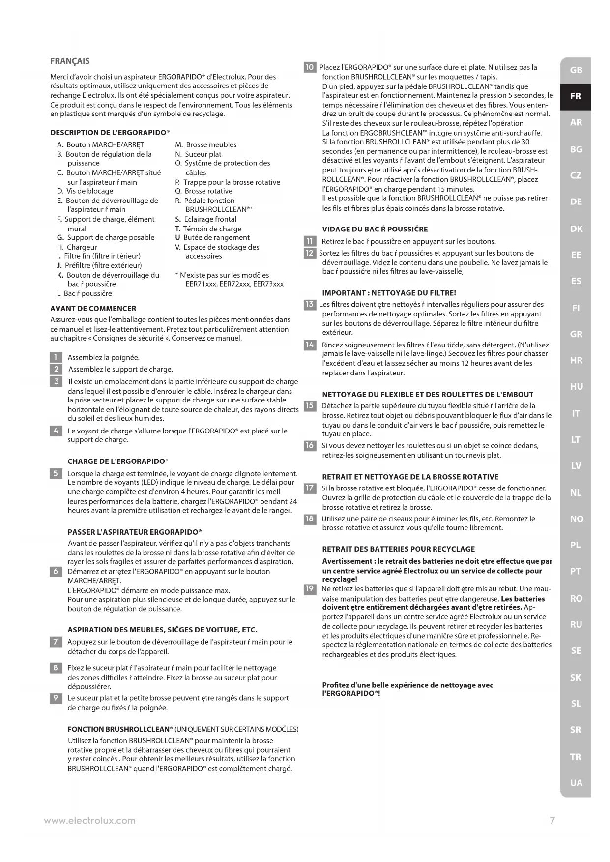 UAFRANÇAIS Merci d’avoir choisi un aspirateur ERGORAPIDO® d'Electrolux. Pour des résultats optimaux, utilisez uniquement des accessoires et pičces de rechange Electrolux. Ils ont été spécialement conçus pour votre aspirateur. Ce produit est conçu dans le respect de l'environnement. Tous les éléments en plastique sont marqués d'un symbole de recyclage.