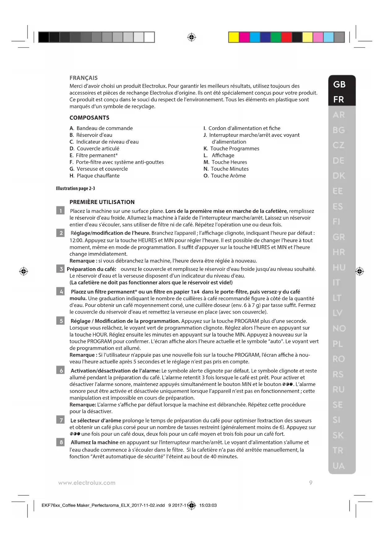 - Si l’appareil ou le cordon d’alimentation est endommagé, il doit être remplacé par le EKF76xx_Coffee Maker_Perfectaroma_ELX_2017-11-02.indd 10 2017-11-03 15:03:0311 www.electrolux.com