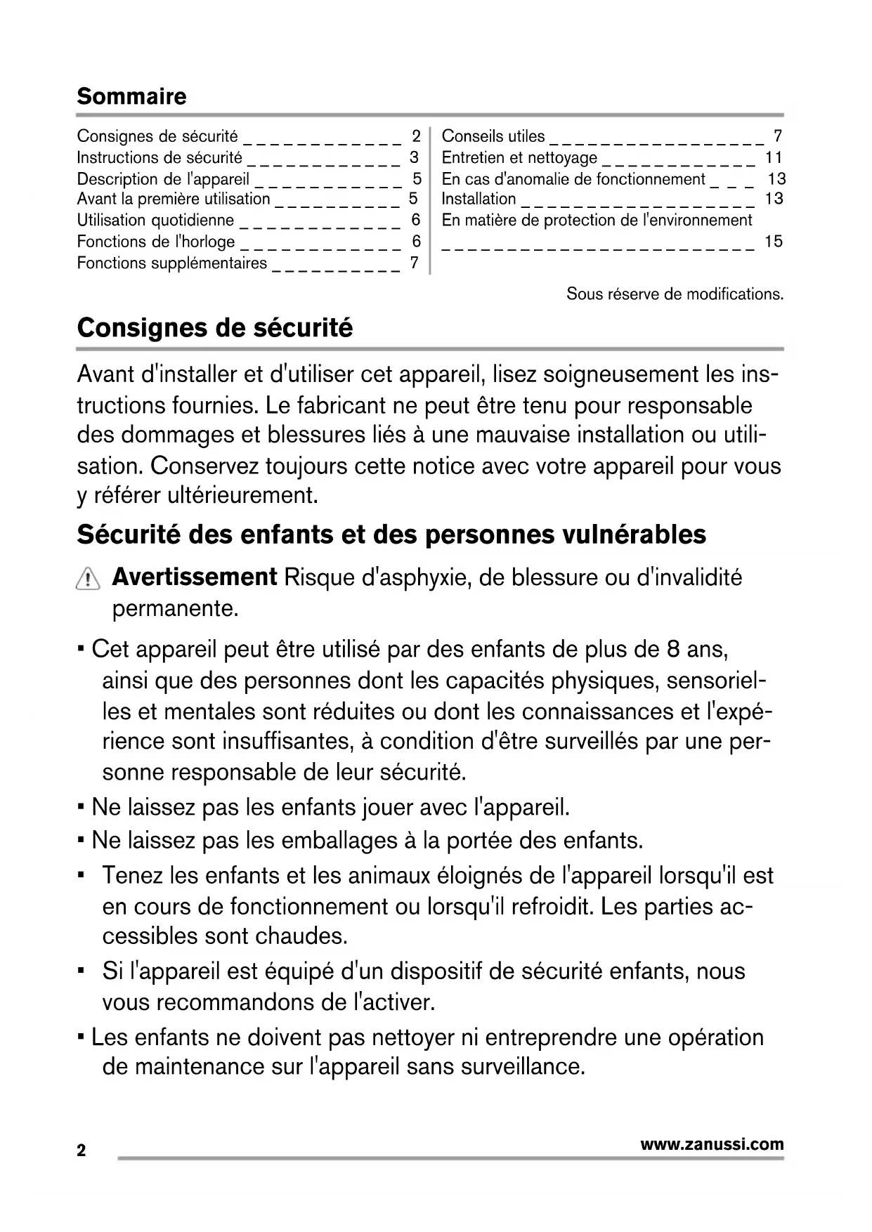 Manual de instrucciones 30 Four Backofen Horno ZOB21301Sommaire Consignes de sécurité _ _ _ _ _ _ _ _ _ _ _ _ 2 Instructions de sécurité _ _ _ _ _ _ _ _ _ _ _ _ 3 Description de l'appareil _ _ _ _ _ _ _ _ _ _ _ 5 Avant la première utilisation _ _ _ _ _ _ _ _ _ _ 5 Utilisation quotidienne _ _ _ _ _ _ _ _ _ _ _ _ 6 Fonctions de l'horloge _ _ _ _ _ _ _ _ _ _ _ _ 6 Fonctions supplémentaires _ _ _ _ _ _ _ _ _ _ 7 Conseils utiles _ _ _ _ _ _ _ _ _ _ _ _ _ _ _ _ _ 7 Entretien et nettoyage _ _ _ _ _ _ _ _ _ _ _ _ 11 En cas d'anomalie de fonctionnement _ _ _ 13 Installation _ _ _ _ _ _ _ _ _ _ _ _ _ _ _ _ _ _ 13 En matière de protection de l'environnement _ _ _ _ _ _ _ _ _ _ _ _ _ _ _ _ _ _ _ _ _ _ _ _ 15 Sous réserve de modifications. Consignes de sécurité Avant d'installer et d'utiliser cet appareil, lisez soigneusement les ins- tructions fournies. Le fabricant ne peut être tenu pour responsable des dommages et blessures liés à une mauvaise installation ou utili- sation. Conservez toujours cette notice avec votre appareil pour vous y référer ultérieurement. Sécurité des enfants et des personnes vulnérables Avertissement Risque d'asphyxie, de blessure ou d'invalidité permanente.