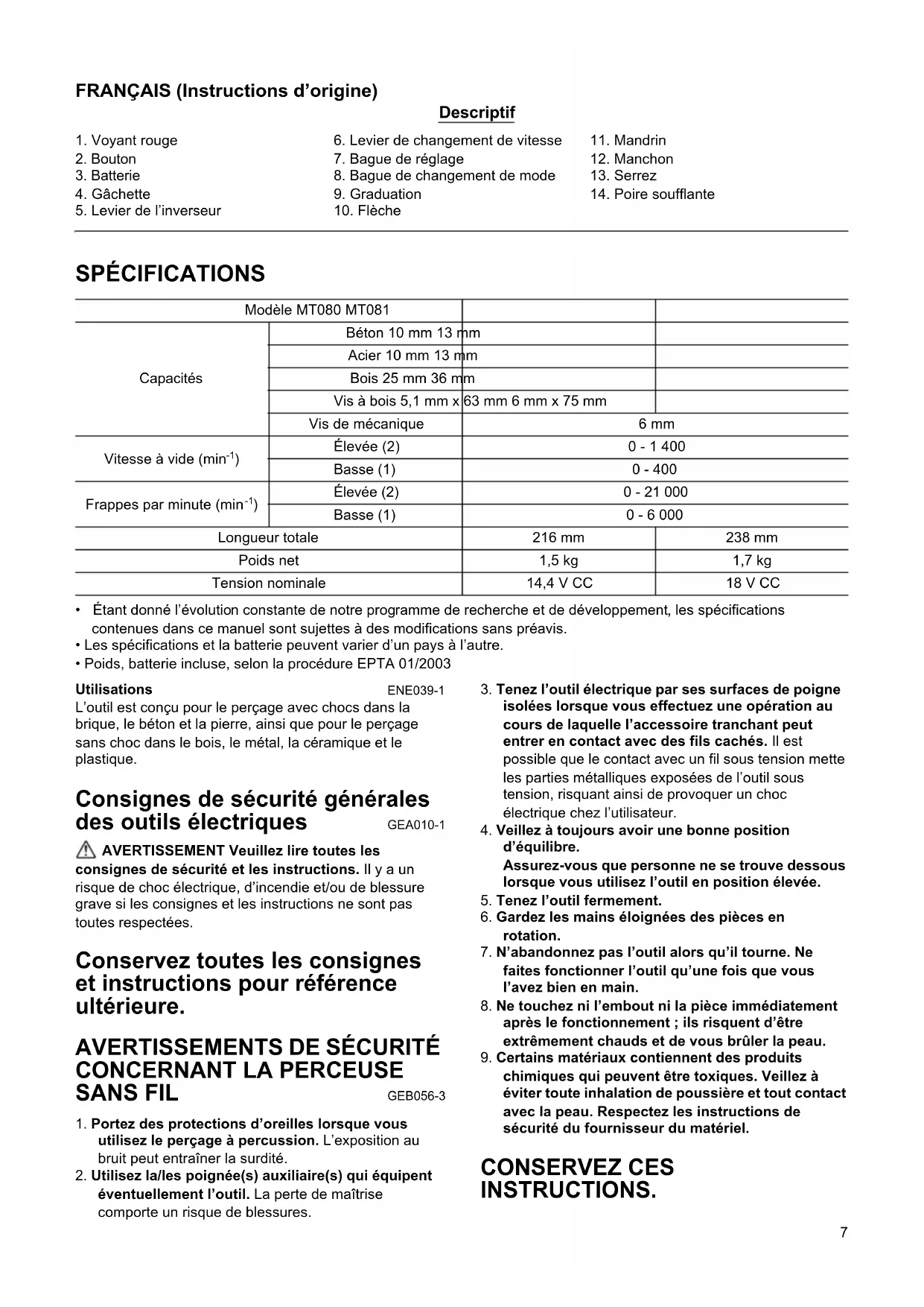 N° de modèle/Type : MT080, MT081