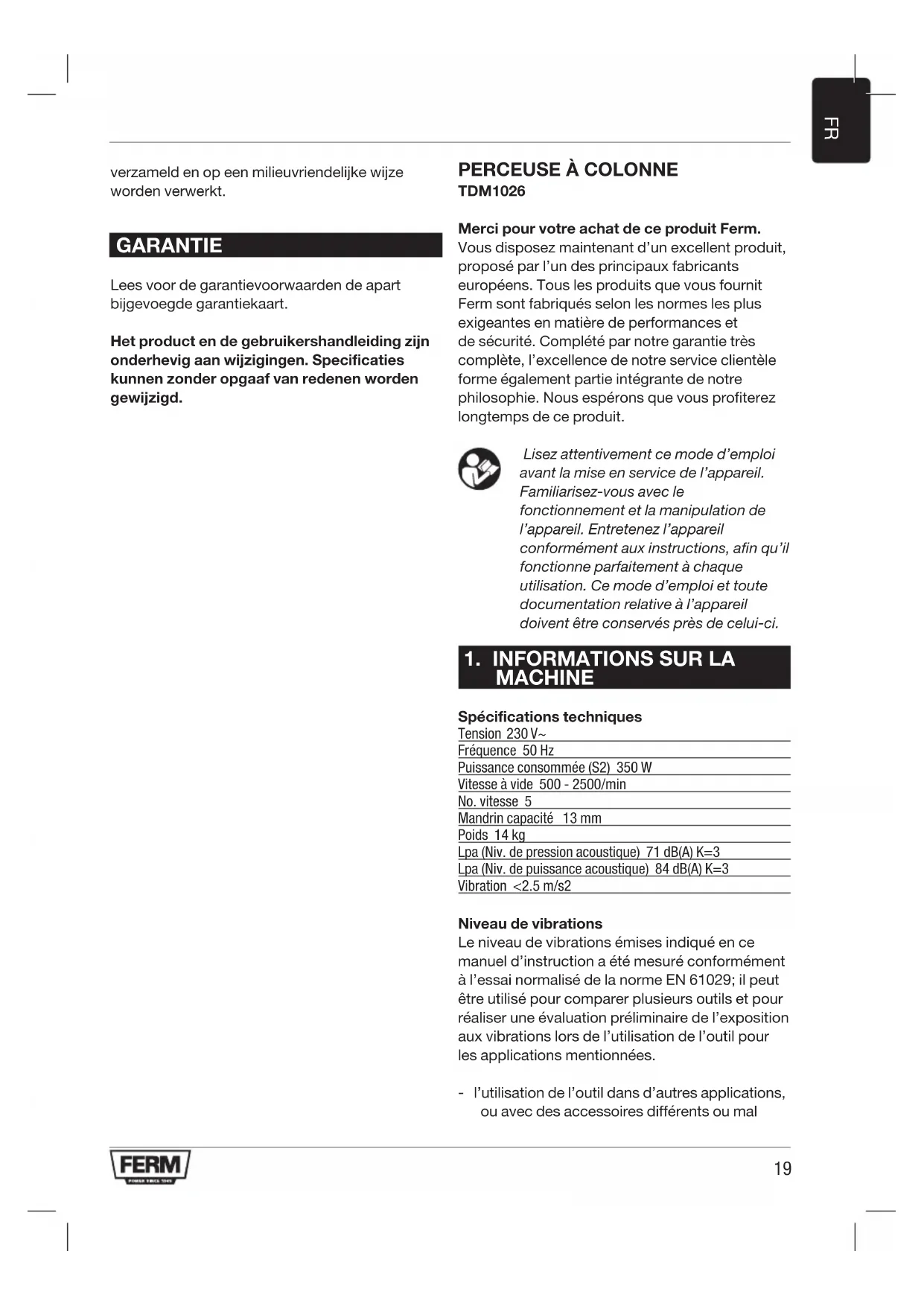 verzameld en op een milieuvriendelijke wijze worden verwerkt. GARANTIE Lees voor de garantievoorwaarden de apart bijgevoegde garantiekaart. Het product en de gebruikershandleiding zijn onderhevig aan wijzigingen. Specificaties kunnen zonder opgaaf van redenen worden gewijzigd. PERCEUSE À COLONNE TDM1026 Merci pour votre achat de ce produit Ferm. Vous disposez maintenant d’un excellent produit, proposé par l’un des principaux fabricants européens. Tous les produits que vous fournit Ferm sont fabriqués selon les normes les plus exigeantes en matière de performances et de sécurité. Complété par notre garantie très complète, l’excellence de notre service clientèle forme également partie intégrante de notre philosophie. Nous espérons que vous profiterez longtemps de ce produit. Lisez attentivement ce mode d’emploi avant la mise en service de l’appareil. Familiarisez-vous avec le fonctionnement et la manipulation de l’appareil. Entretenez l’appareil conformément aux instructions, afin qu’il fonctionne parfaitement à chaque utilisation. Ce mode d’emploi et toute documentation relative à l’appareil doivent être conservés près de celui-ci.
