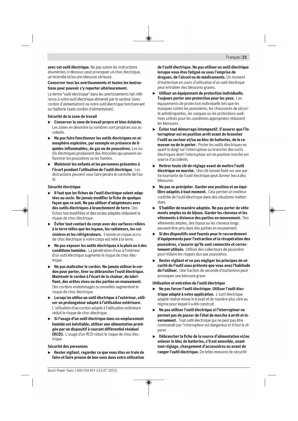 Le niveau de vibration et la valeur d’émission sonore indi- qués dans cette notice d’utilisation ont été mesurés selon une procédure de mesure normalisée et peuvent être utilisés pour établir une comparaison entre différents outils électro- portatifs. Ils peuvent aussi servir de base à une estimation préliminaire du taux de vibration et du niveau sonore. Le niveau de vibration et la valeur d’émission sonore indi- qués s’appliquent pour les utilisations principales de l’outil électroportatif. Si l’outil électroportatif est utilisé pour d’autres applications, avec d’autres accessoires de travail ou sans avoir fait l’objet d’un entretien régulier, le niveau de vi- bration et la valeur d’émission sonore peuvent différer. Il peut en résulter des vibrations et un niveau sonore nette- ment plus élevés pendant toute la durée de travail. Pour une estimation précise du niveau de vibration et du ni- veau sonore, il faut aussi prendre en considération les pé- riodes pendant lesquelles l’outil est éteint ou bien en marche sans être vraiment en action. Il peut en résulter au final un ni- veau de vibration et un niveau sonore nettement plus faibles pendant toute la durée de travail. Prévoyez des mesures de protection supplémentaires per- mettant de protéger l’utilisateur de l’effet des vibrations, par exemple : maintenance de l’outil électroportatif et des acces- soires de travail, maintien des mains au chaud, organisation des procédures de travail. Montage u Retirez l’accu de l’appareil électroportatif avant toute intervention (opérations d’entretien/de maintenance, changement d’accessoire, etc.) ainsi que lors de son transport et rangement. Il y a sinon risque de blessure lorsqu’on appuie par mégarde sur l’interrupteur Marche/ Arrêt. Charge de l’accu (voir figure A) u N’utilisez que les chargeurs indiqués dans les Caracté- ristiques techniques. Seuls ces chargeurs sont adaptés à l’accu Lithium-Ion de votre outil électroportatif. Remarque: L’accu est fourni partiellement chargé. Pour ob- tenir les performances maximales, chargez l’accu jusqu’à sa pleine capacité avant la première utilisation. L’accu Lithium-Ion peut être rechargé à tout moment, sans risquer de réduire sa durée de vie. Le fait d’interrompre le processus de charge n’endommage pas l’accu. L’accu Lithium-Ion est protégé contre une décharge com- plète par «Electronic Cell Protection (ECP)» (l’électronique de protection des cellules). Lorsque l’accu est déchargé, l’outil électroportatif s’arrête grâce à un dispositif d’arrêt de protection: l’accessoire de travail ne tourne plus. u Après l’arrêt automatique de l’outil électroportatif, n’appuyez plus sur l’interrupteur Marche/Arrêt. L’accu pourrait être endommagé. Pour retirer l’accu (1), appuyez sur le bouton de déver- rouillage (2) et sortez l’accu par le bas. Ne forcez pas. Indicateur de niveau de charge de l’accu Les trois LED vertes de l’indicateur d’état de charge(4) in- diquent le niveau de charge de l’accu(1). L’indicateur de ni- veau de charge ne s’allume que pendant les 5s qui suivent la mise en marche. LED Capacité 3 LED allumées en vert ≥2/3 2 LED allumées en vert ≥1/3 1 LED allumée en vert <1/3 1 LED clignotant en vert Réserve 3 LED clignotant en vert vide Si aucune LED ne s’allume après la mise en marche, l’accu est défectueux, il faut le remplacer. Montage/changement de la lame descie u Portez des gants de protection lors du montage ou du remplacement de l’accessoire de travail. Les acces- soires de travail sont tranchants et peuvent devenir chauds lors d’une utilisation prolongée de la scie. Choix de la lame de scie Vous trouverez une vue d’ensemble des lames de scie re- commandées à la fin de cette notice d’utilisation. N’utilisez 1 609 92A 85Y | (15.07.2022) Bosch Power ToolsFrançais | 25 que des lames à emmanchement à simple accroche (emman- chement en T). Choisissez toujours une lame de scie pas plus longue que nécessaire pour la coupe à effectuer. Pour le sciage de courbes serrées, utilisez des lames de scie fines à chantourner. Montage de la lame de scie (voir figureB) u Nettoyez la queue de la lame avant de la mettre en place. Une queue sale ne peut pas être fixée de manière sûre et ferme. Introduisez jusqu’au déclic la lame de scie (13) dans le porte-lame (11) avec les dents orientées dans le sens de la coupe. Le levier SDS (20) pivote automatiquement vers l’ar- rière et bloque la lame de scie. Ne faites pas pivoter le levier (20) vers l’arrière avec la main car l’outil électroportatif pourrait alors être endommagé. Lors du montage de la lame de scie, veillez à ce que le dos de la lame se trouve bien dans la gorge du galet de guidage (10). u Vérifiez le serrage de la lame. Une lame qui a du jeu peut tomber et risque de vous blesser. Éjection de la lame de scie (voir figureC) u Lors de l’éjection de la lame de scie, maintenez tou- jours l’outil électroportatif de sorte qu’aucune per- sonne ni animal puisse être blessé par la lame éjectée. Tournez le levier SDS (20) jusqu’en butée vers l’avant en di- rection du protège-mains (21). La lame se déverrouille et elle est éjectée. Patin de glissement (voirfigureD) Pour effectuer des coupes sur des surfaces fragiles, il est re- commandé de fixer le patin de glissement (17) sur la plaque de base (9) pour éviter de rayer la surface. Pour fixer le patin de glissement (17), accrochez-le à l’avant de la plaque de base (9) puis appuyez vers le haut à l’arrière et laissez-le s’encliqueter. Pare-éclats (voirfigureE) Le pare-éclats (18) (accessoire) évite la formation d’éclats sur les bords lors du sciage de bois. Le pare-éclats ne peut être utilisé que pour certains types de lames de scie et pour un angle de coupe de 0°. Introduisez par l'avant le pare-éclats(1