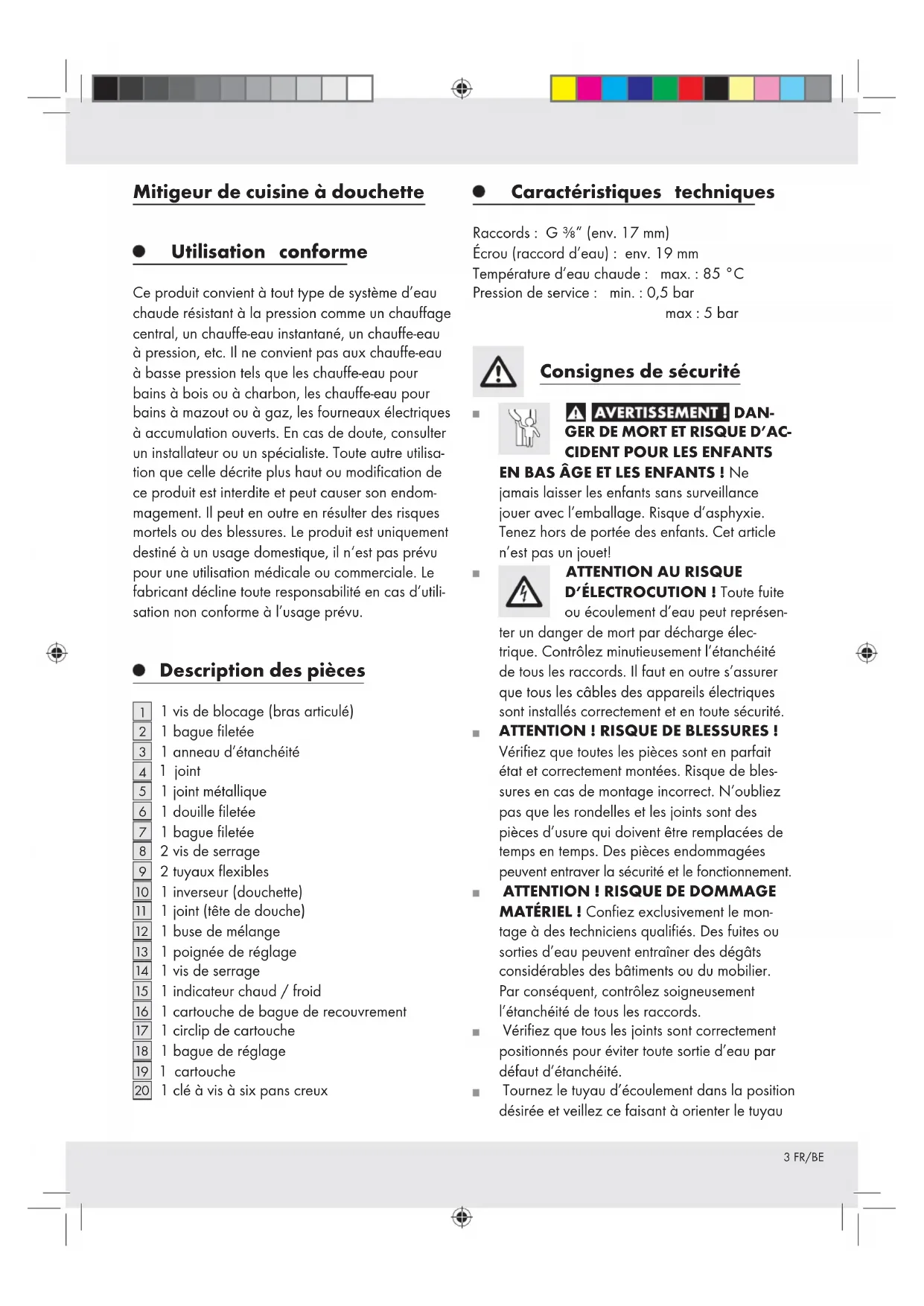 1 clé à vis à six pans creux Caractéristiques techniques Raccords : G ⅜” (env. 17 mm) Écrou (raccord d’eau): env. 19 mm Température d’eau chaude: max. : 85 °C Pression de service : min. : 0,5 bar max : 5 bar Consignes de sécurité DAN- GER DE MORT ET RISQUE D’AC-