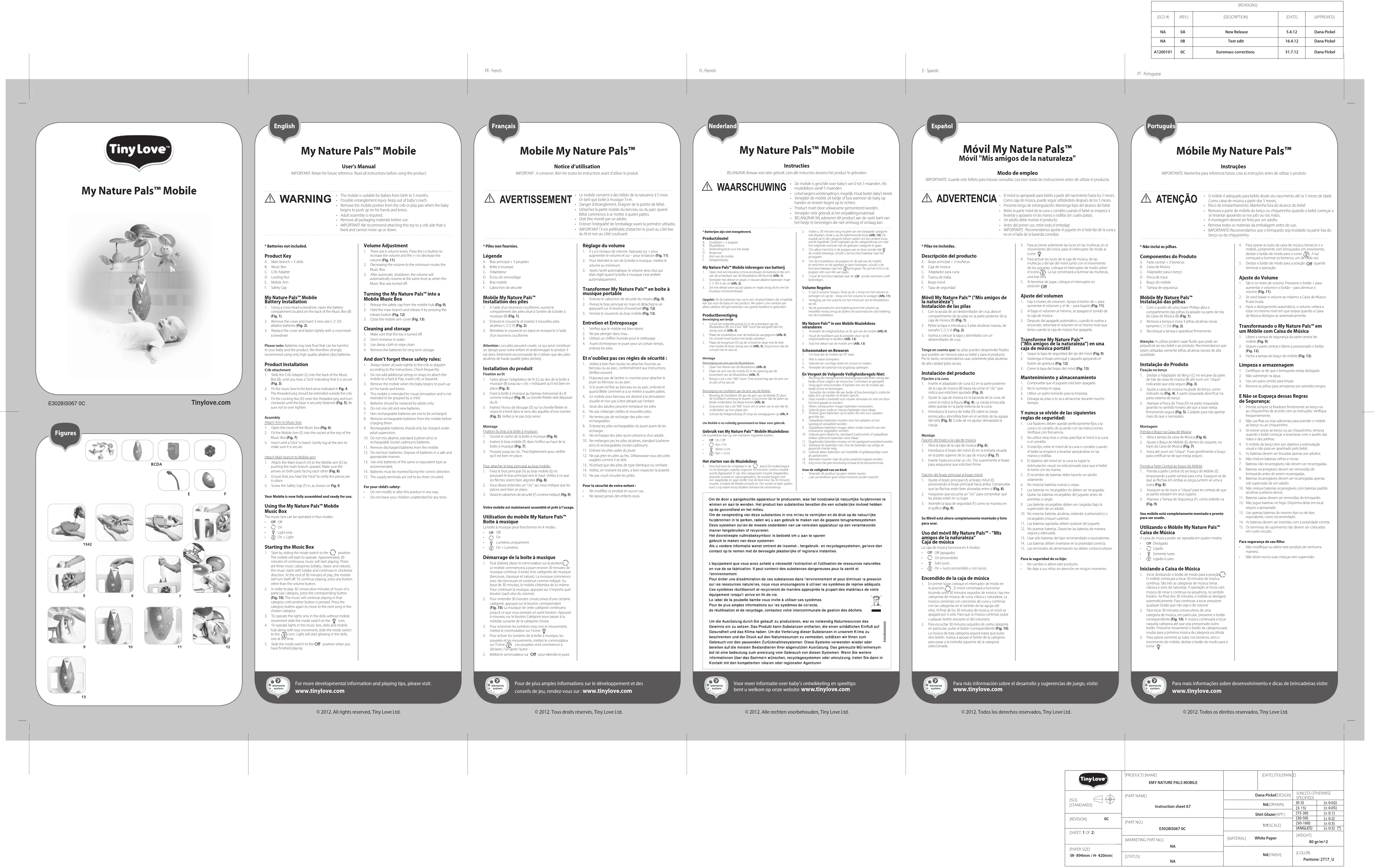 Entretien et Entreposage1. Vériez que le mobile est bien éteint.2. Ne pas plonger dans l'eau.3. Utilisez un chion humide pour le nettoyage.4. Avant d’entreposer le jouet pour un certain temps, enlevez les piles.Et n’oubliez pas ces règles de sécurité :1. Veillez à bien xer toutes les attaches fournies au berceau ou au parc, conformément aux instructions. Vériez souvent.2. N’ajoutez pas de lanière ni courroie pour attacher le jouet au berceau ou au parc.3. Si le jouet est xé au berceau ou au parc, enlevez-le quand Bébé commence à se mettre à quatre pattes.4. Ce mobile pour berceau est destiné à la stimulation visuelle et non pas à être attrapé par l’enfant.5. Seuls des adultes peuvent remplacer les piles.6. Ne pas mélanger vieilles et nouvelles piles.7. Ne tentez pas de recharger des piles non rechargeables.8. Enlevez les piles rechargeables du jouet avant de les recharger.9. Ne rechargez des piles qu’en présence d’un adulte.10. Ne mélangez pas les piles alcalines, standard (carbone-zinc) et rechargeables (nickel-cadmium).11. Enlevez les piles usées du jouet.12. Ne pas jeter les piles au feu. Débarrassez-vous des piles usagées comme il se doit.13. N’utilisez que des piles de type identique ou similaire.14. Veillez, en insérant les piles, à bien respecter la polarité.15. Ne pas court-circuiter les pôles.Pour la sécurité de votre enfant : • Nemodiezceproduitenaucuncas.• Nelaissezjamaisdesenfantsseuls. 4. Para operar as luzes da caixa de música, bonecos e o móbile, juntamente com brinquedos em movimento, deslize o botão de modo para o ícone A luz começará a iluminar os bonecos, um de cada vez.5. Deslize o botão de modo para a posição quando terminar a operação.Ajuste do Volume 1. São 6 os níveis de volume. Pressione o botão + para aumentar o volume e o botão – para diminuir o volume (Fig. 11). 2. Se você baixar o volume ao máximo a Caixa de Música cará muda.3. Após o desligamento automático, o volume voltará a estar no mesmo nível em que estava quando a Caixa de Música desligou-se automaticamente.Transformando o My Nature Pals™ em um Móbile com Caixa de Música1. Libere a tampa de segurança da parte central do móbile (Fig. 9).2. Segure a parte central e libere-a pressionado o botão (Fig. 12).3. Feche a tampa do braço do móbile (Fig. 13). Limpeza e armazenagem1. Certique-se de que o brinquedo esteja desligado.2. Não submergir na água.3. Use um pano úmido para limpar.4. Remove as pilhas para armazenar por períodos longos.E Não se Esqueça dessas Regrasde Segurança:1. Prenda sempre os xadores rmemente ao berço ou ao chiqueirinho de acordo com as instruções. Verique freqüentemente.2. Não use tas ou tiras adicionais para prender o móbile ao berço ou ao chiqueirinho.3. Se estiver preso ao berço ou ao chiqueirinho, remova quando o bebê começar a levantarse com o auxílio das mãos e dos joelhos.4. O móbile de berço tem por objetivo a estimulação visual e não para ser apanhado pelo bebê.5. As baterias devem ser trocadas apenas por adultos.6. Não misture baterias velhas e novas.7. Baterias não-recarregáveis não devem ser recarregadas.8. Baterias recarregáveis devem ser removidas do brinquedo antes de serem recarregadas.9. Baterias recarregáveis devem ser recarregadas apenas sob supervisão de um adulto.10. Não misture baterias recarregáveis com baterias padrão alcalinas (carbono-zinco).11. Baterias vazias devem ser removidas do brinquedo.12. Não jogue baterias no fogo. Disponha delas em local seguro a apropriado.13. Use apenas baterias do mesmo tipo ou de tipo equivalente, como recomendado.14. As baterias devem ser inseridas com a polaridade correta.15. Os terminais de suprimento não devem ser colocados em curto-circuito.Para segurança de seu lho: • Nãomodiqueoualtereesteprodutodenenhumamaneira.• Nãodeixenuncasuascriançassemsupervisão. Volume Adjustment1. There are 6 volume levels. Press the (+) button to increase the volume and the (–) to decrease the volume (Fig. 11). 2. Decreasing the volume to the minimum mutes the Music Box.3. After automatic shutdown, the volume will automatically resume at the same level as when the Music Box was turned o. Turning the My Nature Pals™ into a Mobile Music Box