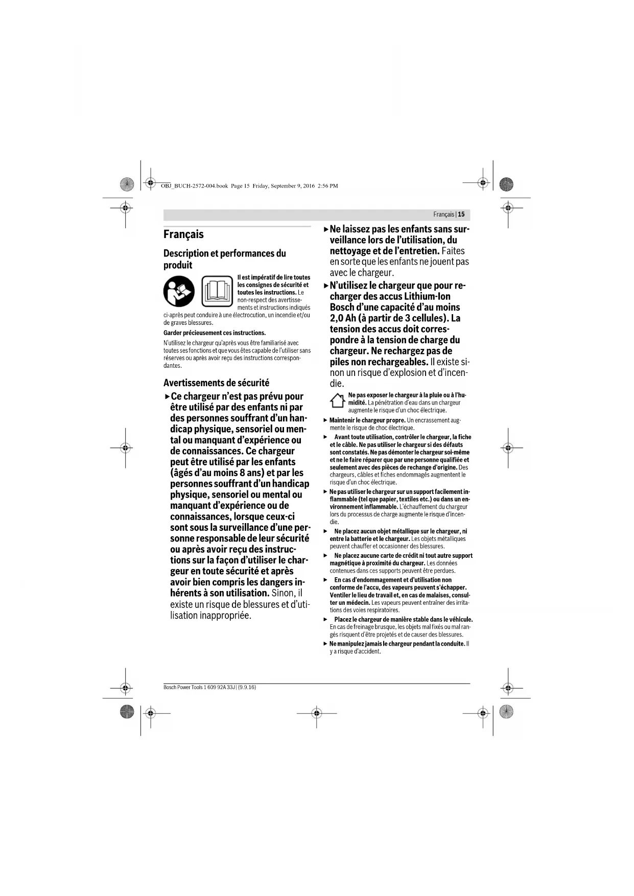 Cause Corrective Measure Red error indicator 5 flashes No charging procedure possible Battery not (correctly) posi- tioned in the L-BOXX Put the battery in the correct position in the Wireless Charging L-BOXX inlay, with the underside of the battery facing the base of the L-BOXX. Detection of foreign object An object other than/in addi- tion to the battery is on the charging platform 1 (possibly in the L-BOXX) Remove object Wrong battery positioned in L-BOXX Position a compatible battery OBJ_BUCH-2572-004.book Page 13 Friday, September 9, 2016 2:56 PM14 | English 1 609 92A 33J | (9.9.16) Bosch Power Tools Maintenance and Service If the battery charger should fail despite the care taken in manufacturing and testing procedures, repair should be car- ried out by an authorised after-sales service agent for Bosch power tools. After-sales Service and Application Service Our after-sales service responds to your questions concern- ing maintenance and repair of your product as well as spare parts. Exploded views and information on spare parts can al- so be found under: www.bosch-pt.com Bosch’s application service team will gladly answer questions concerning our products and their accessories. In all correspondence and spare parts orders, please always include the 10-digit article number given on the nameplate of the product. Great Britain Robert Bosch Ltd. (B.S.C.) P.O. Box 98 Broadwater Park North Orbital Road Denham Uxbridge UB 9 5HJ At www.bosch-pt.co.uk you can order spare parts or arrange the collection of a product in need of servicing or repair. Tel. Service: (0344) 7360109 E-Mail: boschservicecentre@bosch.com Ireland Origo Ltd. Unit 23 Magna Drive Magna Business Park City West Dublin 24 Tel. Service: (01) 4666700 Fax: (01) 4666888 Australia, New Zealand and Pacific Islands Robert Bosch Australia Pty. Ltd. Power Tools Locked Bag 66 Clayton South VIC 3169 Customer Contact Center Inside Australia: Phone: (01300) 307044 Fax: (01300) 307045 Inside New Zealand: Phone: (0800) 543353 Fax: (0800) 428570 Outside AU and NZ: Phone: +61 3 95415555 www.bosch.com.au Republic of South Africa Customer service Hotline: (011) 6519600 Gauteng – BSC Service Centre 35 Roper Street, New Centre Johannesburg Tel.: (011) 4939375 Fax: (011) 4930126 E-Mail: bsctools@icon.co.za KZN – BSC Service Centre Unit E, Almar Centre 143 Crompton Street Pinetown Tel.: (031) 7012120 Fax: (031) 7012446 E-Mail: bsc.dur@za.bosch.com Western Cape – BSC Service Centre Democracy Way, Prosperity Park Milnerton Tel.: (021) 5512577 Fax: (021) 5513223 E-Mail: bsc@zsd.co.za Bosch Headquarters Midrand, Gauteng Tel.: (011) 6519600 Fax: (011) 6519880 E-Mail: rbsa-hq.pts@za.bosch.com Disposal Battery chargers, accessories and packaging should be sort- ed for environmental-friendly recycling. Do not dispose of battery chargers into household waste! Only for EC countries: According to the European Guideline 2012/19/EU for Waste Electrical and Elec- tronic Equipment and its implementation into national right, battery chargers that are no longer usable must be collected sepa- rately and disposed of in an environmental correct manner. Subject to change without notice. Wrong L-BOXX inlay used (as a result, the batteries are not in the correct position) Use the correct L-BOXX inlay (recognisable by Wireless Charging sticker on the L-BOXX) Battery pack defective Replace the battery Standby indicator (green) 3 does not illuminate On-board voltage too low Start engine (charge starter battery). Mains plug of battery charger not plugged in (properly) Insert mains plug (fully) into the socket outlet On-board socket, socket out- let, mains cable or charger defective On-board voltage too low Check mains or on-board voltage, have charger checked if necessary by an authorised after-sales service centre for Bosch power tools. Cause Corrective Measure OBJ_BUCH-2572-004.book Page 14 Friday, September 9, 2016 2:56 PMFrançais | 15 Bosch Power Tools 1 609 92A 33J | (9.9.16) Français Description et performances du produit Il est impératif de lire toutes les consignes de sécurité et toutes les instructions. Le non-respect des avertisse- ments et instructions indiqués ci-après peut conduire à une électrocution, un incendie et/ou de graves blessures. Garder précieusement ces instructions. N’utilisez le chargeur qu’après vous être familiarisé avec toutes ses fonctions et que vous êtes capable de l’utiliser sans réserves ou après avoir reçu des instructions correspon- dantes. Avertissements de sécurité Ce chargeur n’est pas prévu pour être utilisé par des enfants ni par des personnes souffrant d’un han- dicap physique, sensoriel ou men- tal ou manquant d’expérience ou de connaissances. Ce chargeur peut être utilisé par les enfants (âgés d’au moins 8 ans) et par les personnes souffrant d’un handicap physique, sensoriel ou mental ou manquant d’expérience ou de connaissances, lorsque ceux-ci sont sous la surveillance d’une per- sonne responsable de leur sécurité ou après avoir reçu des instruc- tions sur la façon d’utiliser le char- geur en toute sécurité et après avoir bien compris les dangers in- hérents à son utilisation. Sinon, il existe un risque de blessures et d’uti- lisation inappropriée. Ne laissez pas les enfants sans sur- veillance lors de l’utilisation, du nettoyage et de l’entretien. Faites en sorte que les enfants ne jouent pas avec le chargeur. N’utilisez le chargeur que pour re- charger des accus Lithium-Ion Bosch d’une capacité d’au moins 2,0 Ah (à partir de 3 cellules). La tension des accus doit corres- pondre à la tension de charge du chargeur. Ne rechargez pas de piles non rechargeables. Il existe si- non un risque d’explosion et d’incen- die. Ne pas exposer le chargeur à la pluie ou à l’hu- midité. La pénétration d’eau dans un chargeur augmente le risque d’un choc électrique. Maintenir le chargeur propre. Un encrassement aug- mente le risque de choc élect