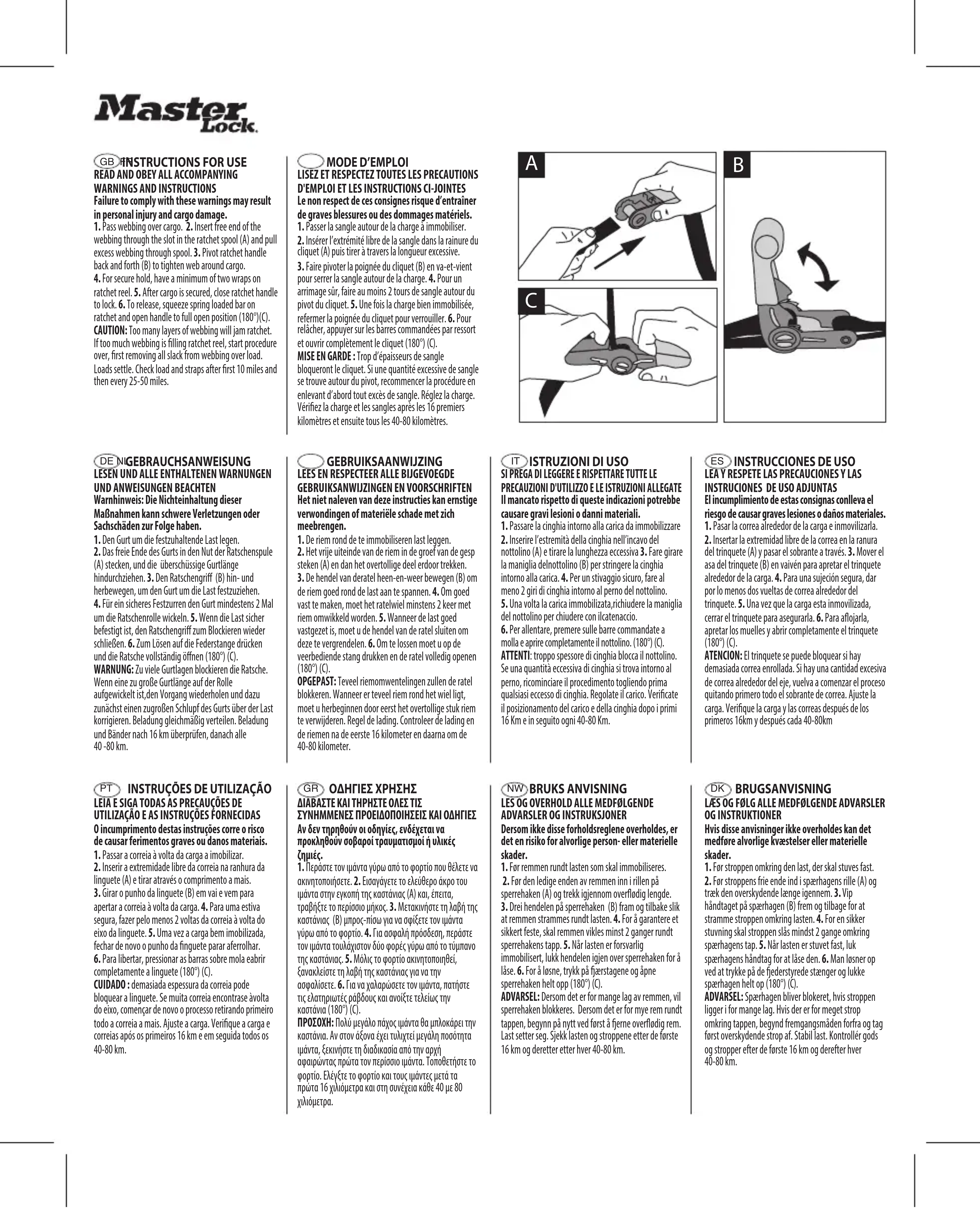Faire pivoter la poignée du cliquet (B) en va-et-vient pour serrer la sangle autore de la charge. 4. Pour un arrimage sûr, faire au moins 2 tours de sangle autore du pivot du cliquet. 5. Une fois la charge bien immobilisée, reférer la poignée du cliquet par revuiller. 6. Pour relâcher, appuyer sur les barres commandées par ressort et ouvoir complètement le cliquet (180°) (C).