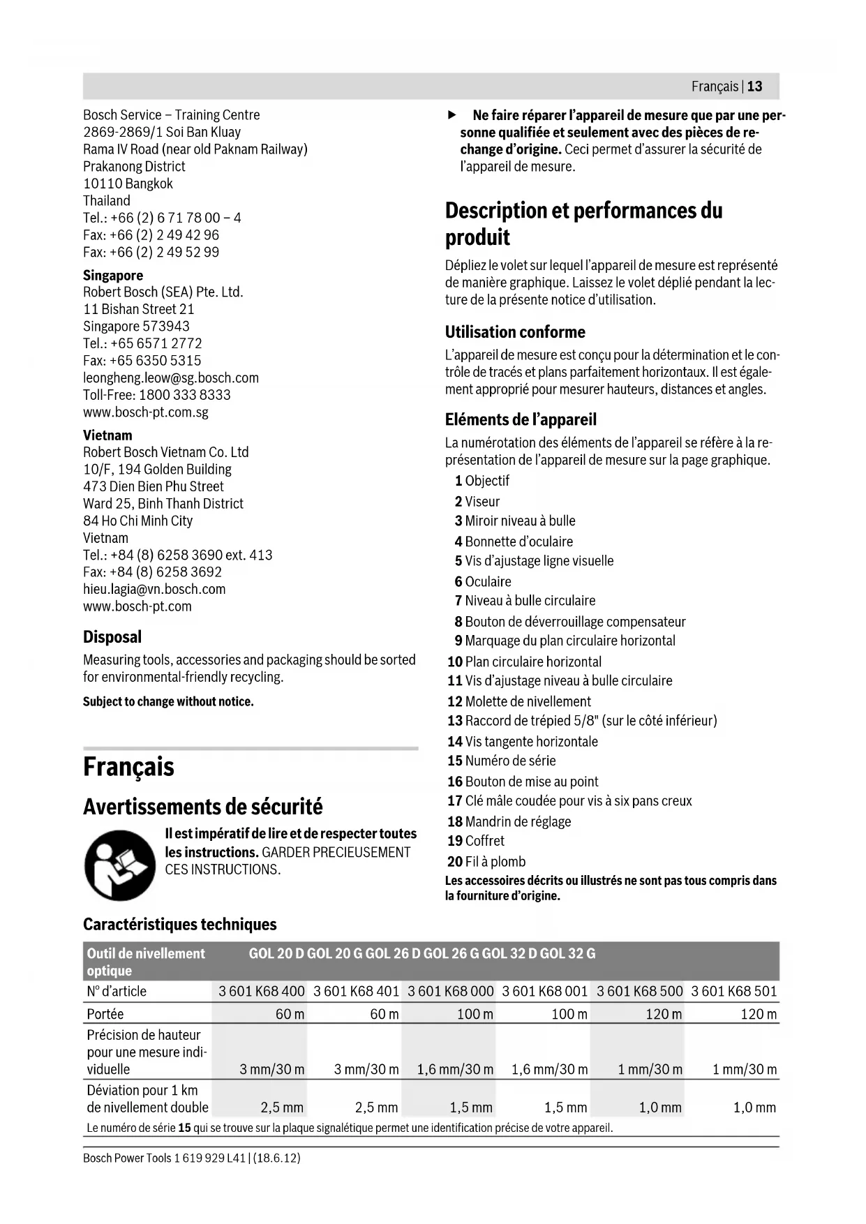 OBJ_BUCH-1239-002.book Page 11 Monday, June 18, 2012 10:51 AM12 | English 1 619 929 L41 | (18.6.12) Bosch Power Tools Australia, New Zealand and Pacific Islands Robert Bosch Australia Pty. Ltd. Power Tools Locked Bag 66 Clayton South VIC 3169 Customer Contact Center Inside Australia: Phone: +61 (01300) 307 044 Fax: +61 (01300) 307 045 Inside New Zealand: Phone: +64 (0800) 543 353 Fax: +64 (0800) 428 570 Outside AU and NZ: Phone: +61 (03) 9541 5555 www.bosch.com.au Republic of South Africa Customer service Hotline: +27 (011) 6 51 96 00 Gauteng – BSC Service Centre 35 Roper Street, New Centre Johannesburg Tel.: +27 (011) 4 93 93 75 Fax: +27 (011) 4 93 01 26 E-Mail: bsctools@icon.co.za KZN – BSC Service Centre Unit E, Almar Centre 143 Crompton Street Pinetown Tel.: +27 (031) 7 01 21 20 Fax: +27 (031) 7 01 24 46 E-Mail: bsc.dur@za.bosch.com Western Cape – BSC Service Centre Democracy Way, Prosperity Park Milnerton Tel.: +27 (021) 5 51 25 77 Fax: +27 (021) 5 51 32 23 E-Mail: bsc@zsd.co.za Bosch Headquarters Midrand, Gauteng Tel.: +27 (011) 6 51 96 00 Fax: +27 (011) 6 51 98 80 E-Mail: rbsa-hq.pts@za.bosch.com People’s Republic of China China Mainland Bosch Power Tools (China) Co., Ltd. 567, Bin Kang Road Bin Jiang District 310052 Hangzhou, P.R.China Service Hotline: 400 826 8484 Fax: +86 571 8777 4502 E-Mail: contact.ptcn@cn.bosch.com www.bosch-pt.com.cn HK and Macau Special Administrative Regions Robert Bosch Hong Kong Co. Ltd. 21st Floor, 625 King’s Road North Point, Hong Kong Customer Service Hotline: +852 2101 0235 Fax: +852 2590 9762 E-Mail: info@hk.bosch.com www.bosch-pt.com.hk Indonesia PT. Multi Mayaka Kawasan Industri Pulogadung Jalan Rawa Gelam III No. 2 Jakarta 13930 Indonesia Tel.: +62 (21) 46 83 25 22 Fax: +62 (21) 46 82 86 45/68 23 E-Mail: sales@multimayaka.co.id www.bosch-pt.co.id Philippines Robert Bosch, Inc. 28th Floor Fort Legend Towers, 3rd Avenue corner 31st Street, Fort Bonifacio Global City, 1634 Taguig City, Philippines Tel.: +63 (2) 870 3871 Fax: +63 (2) 870 3870 matheus.contiero@ph.bosch.com www.bosch-pt.com.ph Bosch Service Center: 9725-27 Kamagong Street San Antonio Village Makati City, Philippines Tel.: +63 (2) 899 9091 Fax: +63 (2) 897 6432 rosalie.dagdagan@ph.bosch.com Malaysia Robert Bosch (S.E.A.) Sdn. Bhd. No. 8A, Jalan 13/6 G.P.O. Box 10818 46200 Petaling Jaya Selangor, Malaysia Tel.: +60 (3) 7966 3194 Fax: +60 (3) 7958 3838 cheehoe.on@my.bosch.com Toll-Free: 1800 880 188 www.bosch-pt.com.my Thailand Robert Bosch Ltd. Liberty Square Building No. 287, 11 Floor Silom Road, Bangrak Bangkok 10500 Tel.: +66 (2) 6 31 18 79 – 18 88 (10 lines) Fax: +66 (2) 2 38 47 83 Robert Bosch Ltd., P. O. Box 2054 Bangkok 10501, Thailand OBJ_BUCH-1239-002.book Page 12 Monday, June 18, 2012 10:51 AMFrançais | 13 Bosch Power Tools 1 619 929 L41 | (18.6.12) Bosch Service – Training Centre 2869-2869/1 Soi Ban Kluay Rama IV Road (near old Paknam Railway) Prakanong District 10110 Bangkok Thailand Tel.: +66 (2) 6 71 78 00 – 4 Fax: +66 (2) 2 49 42 96 Fax: +66 (2) 2 49 52 99 Singapore Robert Bosch (SEA) Pte. Ltd. 11 Bishan Street 21 Singapore 573943 Tel.: +65 6571 2772 Fax: +65 6350 5315 leongheng.leow@sg.bosch.com Toll-Free: 1800 333 8333 www.bosch-pt.com.sg Vietnam Robert Bosch Vietnam Co. Ltd 10/F, 194 Golden Building 473 Dien Bien Phu Street Ward 25, Binh Thanh District 84 Ho Chi Minh City Vietnam Tel.: +84 (8) 6258 3690 ext. 413 Fax: +84 (8) 6258 3692 hieu.lagia@vn.bosch.com www.bosch-pt.com Disposal Measuring tools, accessories and packaging should be sorted for environmental-friendly recycling. Subject to change without notice. Français Avertissements de sécurité Il est impératif de lire et de respecter toutes les instructions. GARDER PRECIEUSEMENT CES INSTRUCTIONS. f Ne faire réparer l’appareil de mesure que par une per- sonne qualifiée et seulement avec des pièces de re- change d’origine. Ceci permet d’assurer la sécurité de l’appareil de mesure. Description et performances du produit Dépliez le volet sur lequel l’appareil de mesure est représenté de manière graphique. Laissez le volet déplié pendant la lec- ture de la présente notice d’utilisation. Utilisation conforme L’appareil de mesure est conçu pour la détermination et le con- trôle de tracés et plans parfaitement horizontaux. Il est égale- ment approprié pour mesurer hauteurs, distances et angles. Eléments de l’appareil La numérotation des éléments de l’appareil se réfère à la re- présentation de l’appareil de mesure sur la page graphique. 1 Objectif 2 Viseur 3 Miroir niveau à bulle 4 Bonnette d’oculaire 5 Vis d’ajustage ligne visuelle 6 Oculaire 7 Niveau à bulle circulaire 8 Bouton de déverrouillage compensateur 9 Marquage du plan circulaire horizontal 10 Plan circulaire horizontal 11 Vis d’ajustage niveau à bulle circulaire 12 Molette de nivellement 13 Raccord de trépied 5/8" (sur le côté inférieur) 14 Vis tangente horizontale 15 Numéro de série 16 Bouton de mise au point 17 Clé mâle coudée pour vis à six pans creux 18 Mandrin de réglage 19 Coffret 20 Fil à plomb Les accessoires décrits ou illustrés ne sont pas tous compris dans la fourniture d’origine. Caractéristiques techniques Outil de nivellement optique GOL 20 D GOL 20 G GOL 26 D GOL 26 G GOL 32 D GOL 32 G N° d’article 3 601 K68 400 3 601 K68 401 3 601 K68 000 3 601 K68 001 3 601 K68 500 3 601 K68 501 Portée 60 m 60 m 100 m 100 m 120 m 120 m Précision de hauteur pour une mesure indi- viduelle 3 mm/30 m 3 mm/30 m 1,6 mm/30 m 1,6 mm/30 m 1 mm/30 m 1 mm/30 m Déviation pour 1 km de nivellement double 2,5 mm 2,5 mm 1,5 mm 1,5 mm 1,0 mm 1,0 mm Le numéro de série 15 qui se trouve sur la plaque signalétique permet une identification précise de votre appareil. OBJ_BUCH-1239-002.book Page 13 Monday, June 18, 2012 10:51 AM14 | Français 1 619 929 L41 | (18.6.12) Bosch Power Tools Fonctionnement f Contrôlez la précision de nivellement et d’affichage de l’appareil de mes