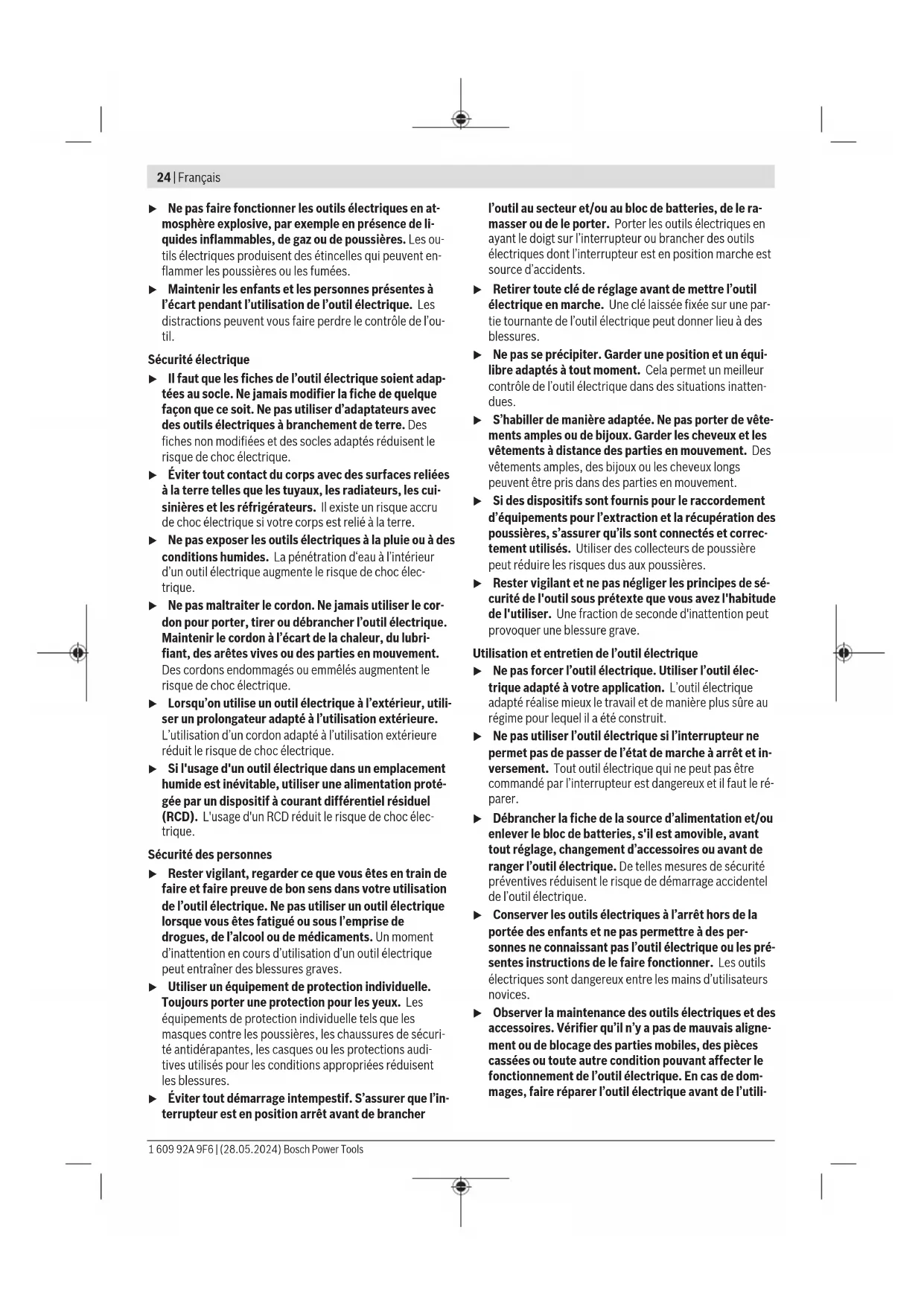The 0° cut mark (11) indicates the position of the saw blade when making a right-angled cut. The 45° cut mark (10) indic- ates the position of the saw blade when making a 45° cut. For a precise cut, place the circular saw against the work- piece as shown in the figure. We recommend making a test cut. GKS 18V-57 G: When using the FSN guide rail system, the power tool can stay in the holder for the guide rail when making mitre cuts. (10) Use only cut marks (10) when making a right-angled cut and a 45º cut with the guide rail. Start-up Switching on/off To start the power tool, first press the lock-off switch (1), then press and hold the on/off switch (18). To switch off the power tool, release the on/off switch (18). Note: For safety reasons, the on/off switch (18) cannot be locked; it must remain pressed during the entire operation. Run-out brake An integrated run-out brake shortens the time the saw blade keeps running for after the power tool has been switched off. Protection Against Deep Discharging The lithium-ion battery is protected against deep discharge by the Electronic Cell Protection (ECP). When the battery is discharged, the power tool is switched off by means of a pro- tective circuit: The application tool no longer rotates. Practical advice u Before carrying out any work on the power tool (e.g. maintenance, tool change etc.), remove the battery from the power tool. There is risk of injury from uninten- tionally pressing the on/off switch. The width of cut varies depending on the saw blade used. Protect saw blades against shock and impact. Guide the power tool evenly, pushing it gently in the cutting direction in order to achieve a high cut quality. Applying too much pressure will significantly reduce the service life of ap- plication tools and can damage the power tool. Always work with uniform feed and ensure that the speed of the saw blade stays constant. Avoid increasing pressure (e.g. when working with damp wood, pressure-treated con- struction timber or waste wood) and the resulting speed re- duction in order to prevent the saw blade teeth from over- heating. The sawing performance and the quality of the cut essen- tially depend on the condition and the tooth shape of the saw blade. This is why you should only use sharp saw blades that are suitable for the material being machined. Sawing wood Choosing the right saw blade depends on the wood type, wood quality and whether cuts with or against the grain are required. Making cuts in spruce with the grain produces long, spiral- shaped chips. Beech and oak dust is especially detrimental to health. Therefore, work only with dust extraction. Sawing with the parallel guide (see figure D) The parallel guide (12) allows you to make precise cuts along the edge of a workpiece and cut strips with the same dimensions. Sawing with an auxiliary guide (see figure E) For working on large workpieces or for cutting straight edges, you can securely fasten a board or rail to the work- piece as an auxiliary guide. The circular saw can be guided along the path of this auxiliary guide with the base plate. Sawing with the guide rail (see figure F) You can use the guide rail (34) to produce straight cuts. Note: Only use the guide rail (34) for right-angled cuts. At- tempting mitre/bevel cuts could damage the guide rail (34) . The adhesive layer prevents the guide rail from slipping and preserves the surface of the workpiece. The guide rail's coat- ing allows the power tool to glide more easily. Place the circular saw directly on the guide rail (34). Fasten the guide rail (34) to the workpiece using suitable clamping devices, e.g. screw clamps, so that the narrow side of the guide rail (34) is facing the saw blade. The guide rail (34) must not protrude over the edge of the workpiece being sawn into. Switch on the power tool and push it gently in the cutting dir- ection, guiding it evenly. The connector (36) can be used to join two guide rails. The four screws in the connector are used for the purpose of clamping. Maintenance and Service Maintenance and Cleaning u Before carrying out any work on the power tool (e.g. maintenance, tool change etc.), remove the battery 1 609 92A 9F6 | (28.05.2024) Bosch Power ToolsFrançais | 23 from the power tool. There is risk of injury from uninten- tionally pressing the on/off switch. u To ensure safe and efficient operation, always keep the power tool and the ventilation slots clean. The retracting blade guard must always be able to move freely and retract automatically. It is therefore important to keep the area around the retracting blade guard clean at all times. Remove dust and chips with a paintbrush. Non-coated saw blades can be protected against corrosion using a thin layer of acid-free oil. Remove the oil again before sawing as failure to do so will stain the wood. Resin or glue residue on the saw blade has a detrimental ef- fect on the quality of the cut. You should therefore clean saw blades straight after use. After-Sales Service and Application Service Our after-sales service responds to your questions concern- ing maintenance and repair of your product as well as spare parts. You can find explosion drawings and information on spare parts at: www.bosch-pt.com The Bosch product use advice team will be happy to help you with any questions about our products and their accessor- ies. In all correspondence and spare parts orders, please always include the 10‑digit article number given on the nameplate of the product. Great Britain Robert Bosch Ltd. (B.S.C.) P.O. Box 98 Broadwater Park North Orbital Road Denham Uxbridge UB 9 5HJ At www.bosch-pt.co.uk you can order spare parts or arrange the collection of a product in need of servicing or repair. Tel. Service: (0344) 7360109 E-Mail: boschservicecentre@bosch.com You can find further service addresses at: www.bosch-pt.com/serviceaddresses Transport The recommended lithium-ion batteries are subject to legis- lation on the transport of dangerous goods. The 