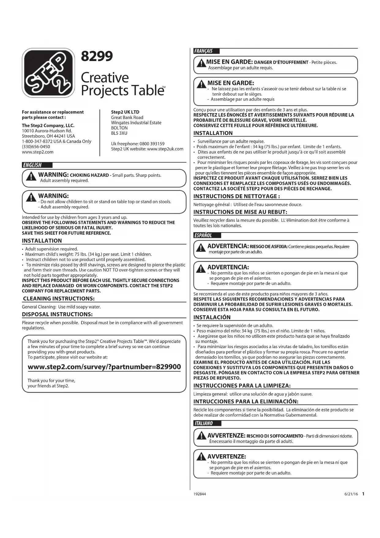 - Pour minimiser les risques posés par les copeaux de forage, les vis sont conçues pour percer le plastique et former leur propre filetage. Veillez à ne pas trop serrer les vis pour qu’elles tiennent les pièces ensemble de façon appropriée. INSPECTEZ CE PRODUIT AVANT CHAQUE UTILISATION. SERREZ BIEN LES CONNEXIONS ET REMPLACEZ LES COMPOSANTS USÉS OU ENDOMMAGÉS. CONTACTEZ LA SOCIÉTÉ STEP2 POUR DES PIÈCES DE RECHANGE. INSTRUCTIONS DE NETTOYAGE : Nettoyage général : Utilisez de l’eau savonneuse douce. INSTRUCTIONS DE MISE AU REBUT: Veuillez recycler dans la mesure du possible. LL’élimination doit être conforme à toutes les lois nationales. MISE EN GARDE: - Ne laissez pas les enfants s’asseoir ou se tenir debout sur la table ni se tenir debout sur le sièges. - Assemblage par un adulte requis Se recomienda el uso de este producto para niños mayores de 3 años. RESPETE LAS SIGUIENTES RECOMENDACIONES Y ADVERTENCIAS PARA DISMINUIR LA PROBABILIDAD DE SUFRIR LESIONES GRAVES O MORTALES. CONSERVE ESTA HOJA PARA SU CONSULTA EN EL FUTURO. INSTALACIÓN