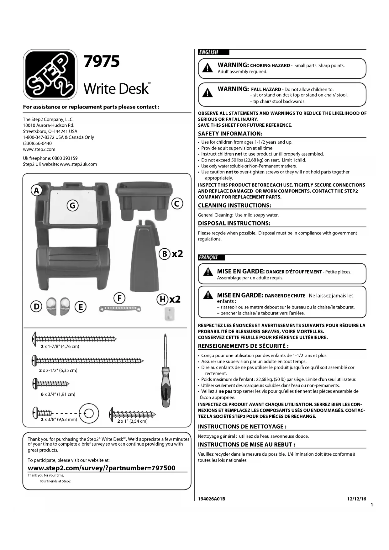 sit or stand on desk top or stand on chair/ stool. – tip chair/ stool backwards.OBSERVE ALL STATEMENTS AND WARNINGS TO REDUCE THE LIKELIHOOD OF SERIOUS OR FATAL INJURY. SAVE THIS SHEET FOR FUTURE REFERENCE.SAFETY INFORMATION:• Use for children from ages 1-1/2 years and up. • Provide adult supervision at all time.• Instruct children not to use product until properly assembled.• Do not exceed 50 lbs (22,68 kg) on seat. Limit 1child.• Use only water soluble or Non-Permanent markers.• Use caution not to over-tighten screws or they will not hold parts together appropriately.INSPECT THIS PRODUCT BEFORE EACH USE. TIGHTLY SECURE CONNECTIONS AND REPLACE DAMAGED OR WORN COMPONENTS. CONTACT THE STEP2 COMPANY FOR REPLACEMENT PARTS.CLEANING INSTRUCTIONS:General Cleaning: Use mild soapy water.DISPOSAL INSTRUCTIONS:Please recycle when possible. Disposal must be in compliance with government regulations.RESPECTEZ LES ÉNONCÉS ET AVERTISSEMENTS SUIVANTS POUR RÉDUIRE LA PROBABILITÉ DE BLESSURES GRAVES, VOIRE MORTELLES. CONSERVEZ CETTE FEUILLE POUR RÉFÉRENCE ULTÉRIEURE.RENSEIGNEMENTS DE SÉCURITÉ :• Conçu pour une utilisation par des enfants de 1-1/2 ans et plus.• Assurer une supervision par un adulte en tout temps.• Dire aux enfants de ne pas utiliser le produit jusqu’à ce qu’il soit assemblé cor rectement.• Poids maximum de l’enfant : 22,68 kg. (50 lb) par siège. Limite d’un seul utilisateur.• Utiliser seulement des marqueurs solubles dans l’eau ou non-permanents.• Veillez à ne pas trop serrer les vis pour qu’elles tiennent les pièces ensemble de façon appropriée. INSPECTEZ CE PRODUIT AVANT CHAQUE UTILISATION. SERREZ BIEN LES CONNEXIONS ET REMPLACEZ LES COMPOSANTS USÉS OU ENDOMMAGÉS. CONTACTEZ LA SOCIÉTÉ STEP2 POUR DES PIÈCES DE RECHANGE.INSTRUCTIONS DE NETTOYAGE :Nettoyage général : utilisez de l’eau savonneuse douce.INSTRUCTIONS DE MISE AU REBUT :Veuillez recycler dans la mesure du possible. L’élimination doit être conforme à toutes les lois nationales. MISE EN GARDE: DANGER D’ÉTOUFFEMENT - Petite pièces. Assemblage par un adulte requis. MISE EN GARDE: DANGER DE CHUTE - Ne laissez jamais les enfants : – s’asseoir ou se mettre debout sur le bureau ou la chaise/le tabouret.– pencher la chaise/le tabouret vers l’arrière. Write Desk