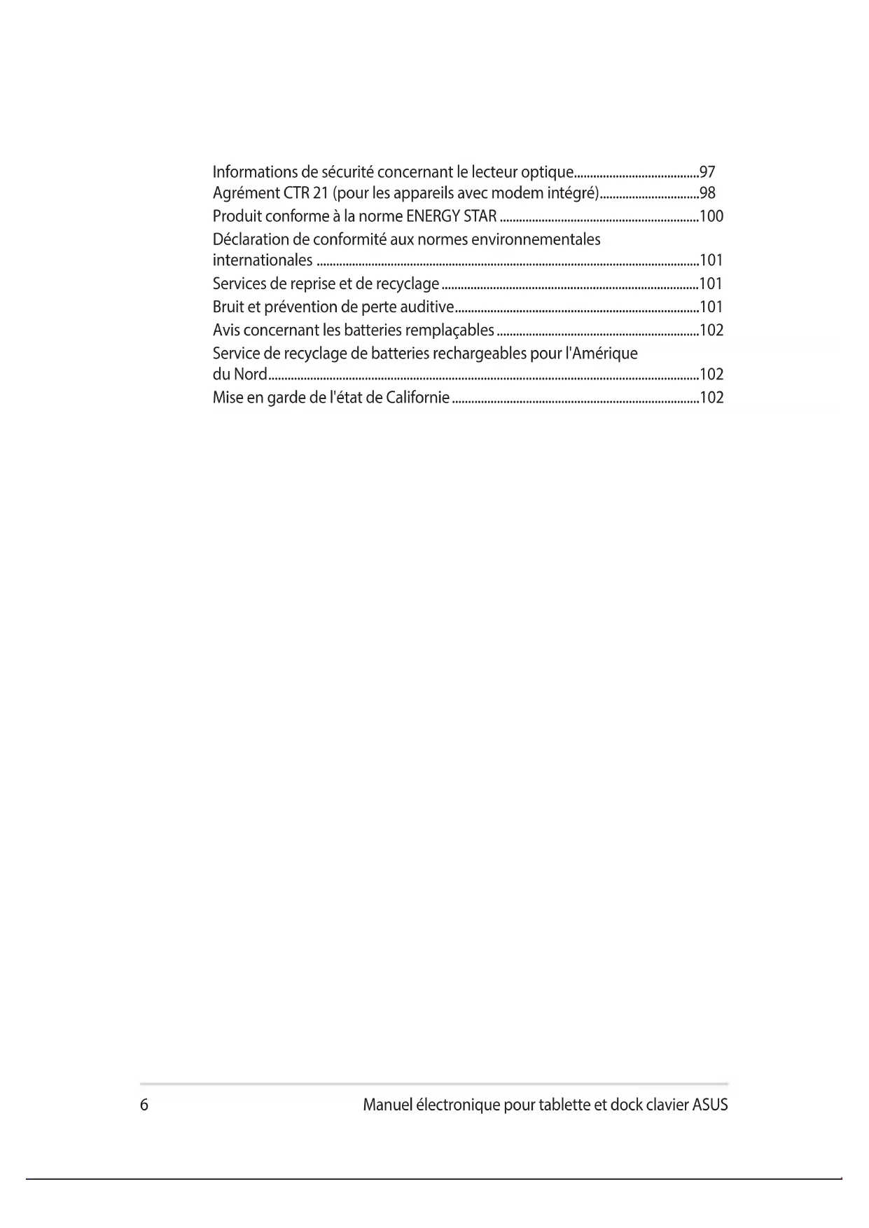 Mise au rebut NE PAS jeter ce produit avec les déchets ménagers. Ce produit a été conçu pour permettre une réutilisation et un recyclage appropriés des pièces. Le symbole représentant une benne barrée d'une croix indique que le produit (équipement électrique, électronique et batterie contenant du mercure) ne doit pas être jeté avec les déchets ménagers. Consultez les réglementations locales pour la mise au rebut des produits électroniques. NE PAS jeter la batterie avec les déchets ménagers. Le symbole représentant une benne barrée d'une croix indique que la batterie ne doit pas être jetée avec les déchets ménagers.12 Manuel électronique pour tablette et dock clavier ASUSManuel électronique pour tablette et dock clavier ASUS