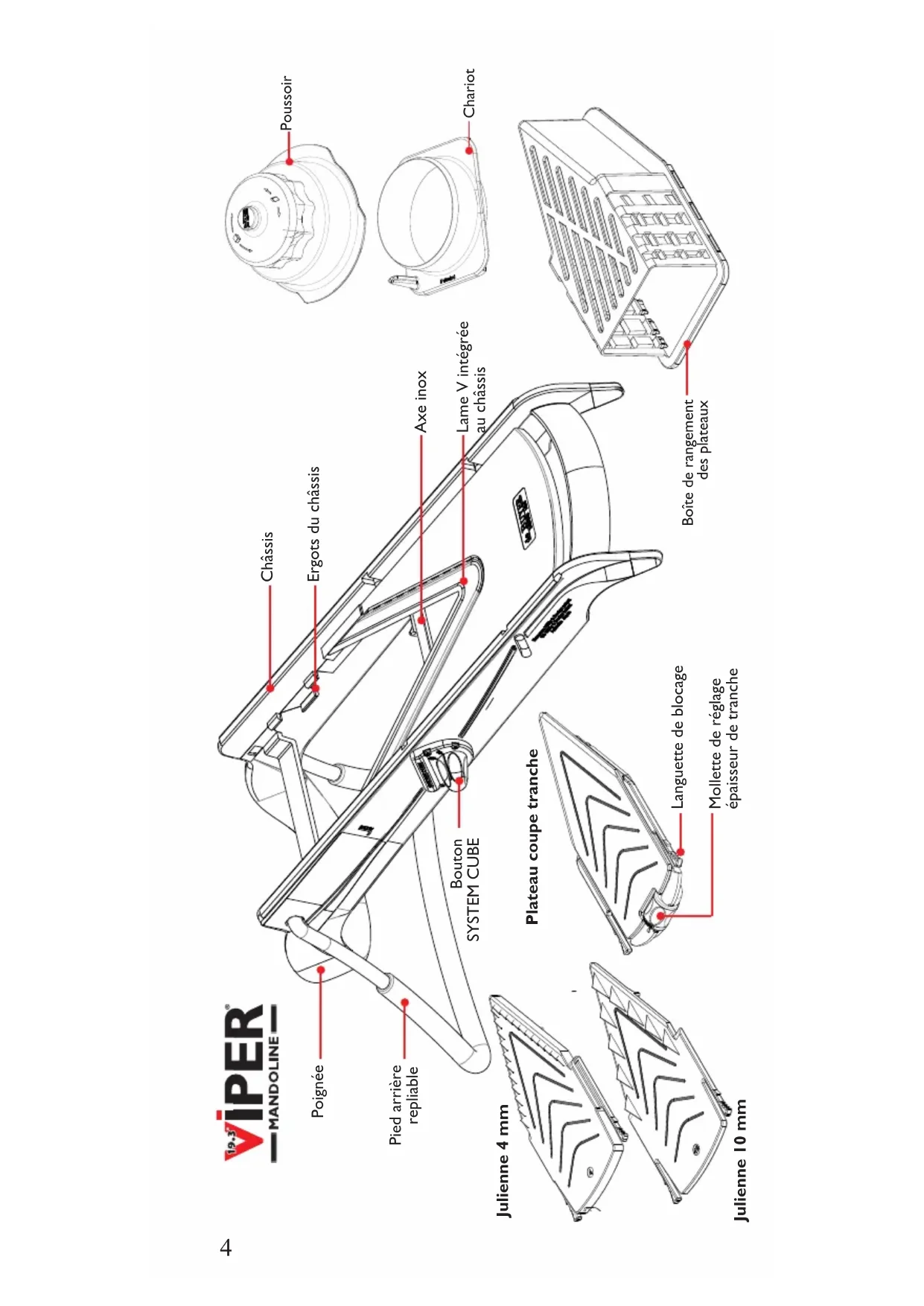 - Le chariot et son poussoir apportent une garantie de sécurité; il est indisponible de les mettre en place lors de l'utilisation de la Mandoline VIPER.