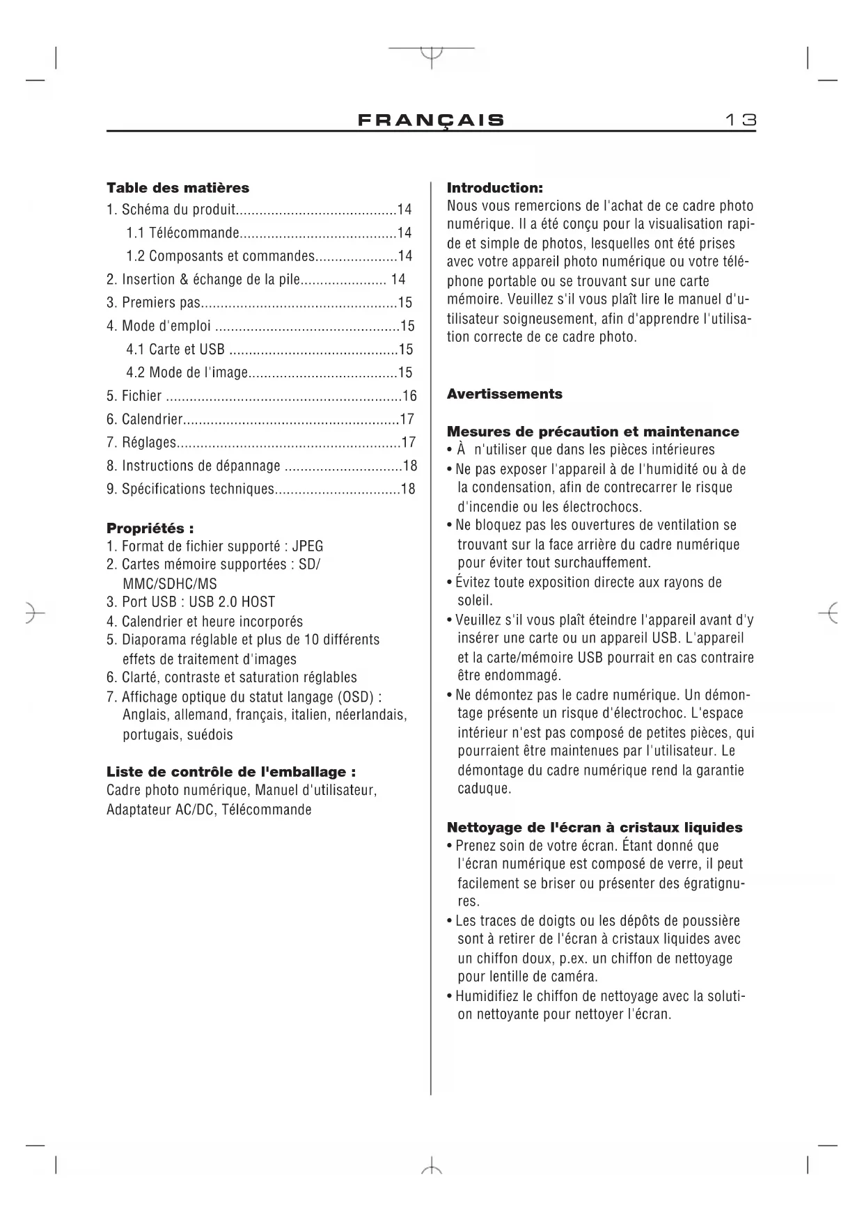 Anglais, allemand, français, italien, néerlandais, portugais, suédois Liste de contrôle de l'emballage : Cadre photo numérique, Manuel d'utilisateur, Adaptateur AC/DC, Télécommande Introduction: Nous vous remercions de l'achat de ce cadre photo numérique. Il a été conçu pour la visualisation rapi- de et simple de photos, lesquelles ont été prises avec votre appareil photo numérique ou votre télé- phone portable ou se trouvant sur une carte mémoire. Veuillez s'il vous plaît lire le manuel d'u- tilisateur soigneusement, afin d'apprendre l'utilisa- tion correcte de ce cadre photo. Avertissements Mesures de précaution et maintenance