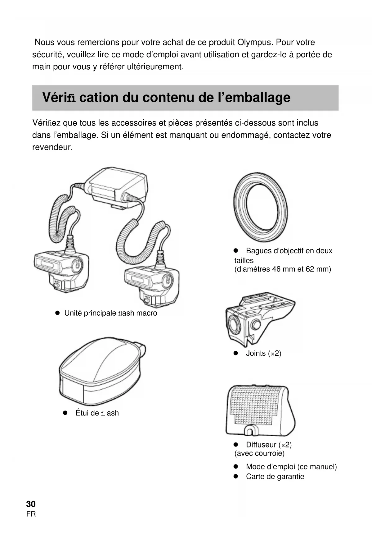 Nous vous remercions pour votre achat de ce produit Olympus. Pour votre sécurité, veuillez lire ce mode d’emploi avant utilisation et gardez-le à portée de main pour vous y référer ultérieurement. Vérifi cation du contenu de l’emballage Vérifi ez que tous les accessoires et pièces présentés ci-dessous sont inclus dans l’emballage. Si un élément est manquant ou endommagé, contactez votre revendeur. Mode d’emploi (ce manuel) Carte de garantie Unité principale fl ash macro Étui de fl ash Bagues d’objectif en deux tailles (diamètres 46 mm et 62 mm) Joints (×2) Diffuseur (×2) (avec courroie)31