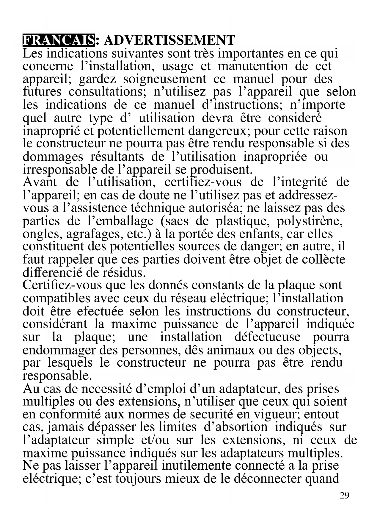 Ne jamais plonger l'appareil dans l'eau ou dans d'autres liquides. Ne pas employer l'appareil en présence d'explosifs, de substances fortement inflammables, de gaz ou de feu.32 Ne pas utiliser l'appareil a proximité d'une baignoire, de la douche, du lavabo et aux endroits où la présence de l'eau puisse se révéler une source de danger. Ne jamais tirer sur le cordon d'alimentation électrique ou sur l'appareil pour débrancher la fiche de la prise de courant. Débrancher toujours l'appareil lorsqu'on ne l'utilise pas et avant son nettoyage. Quand on utilise le four laisser au moin 10 centimètres de place tout autour pour favoriser la circulation de l'air. Ne pas introduir des aliments trop grands ou des outils métalliques: il y a le risque d'incendies ou de chocs électriques. La pizza, le pain et les autres aliments peuvent brûler donc l'appareil doit être utilisé loin des rideaux ou des autres matériaux facilement inflammables. Ne poser aucun objet sur le four pendant le fonctionnement. Si le four est couvert ou entre en contact avec matériaux inflammables (rideaux, étoffe, cloisons, ou similaires) pendant le fonctionnement, des flammes peuvent se produire. Le pain et autres aliments peuvent brûler donc, il est conseillé de garder l'appareil loin des rideaux ou des autres matériaux inflammables. Ne pas introduir dans le four matériels type carton, plastique, papier, ou similaires parce qu'ils sont inflammables. Ne pas laisser à l'intérieur de four n'importe quel matériel, une fois éteint, sauf que ses accessoires. L'appareil est éteint seulement quand la fiche est débranché de la prise de courant. Attention! Positionner le four à pizza en manière de faciliter l'ouverture du couvercle à droite ou à gauche. Ne pas l'ouvrir de front, la vapeur est très chaude! Ouvrir le couvercle du four à pizza en manière et avec la même33 attention qu'on prête en soulevant les couvercles des marmites sur le feu." Porter toujours des gants pour introduir ou enlever des objets du four chaud. Faitez lire ce mode d'emploi aux autres possibles utiliseurs de l'appareil.