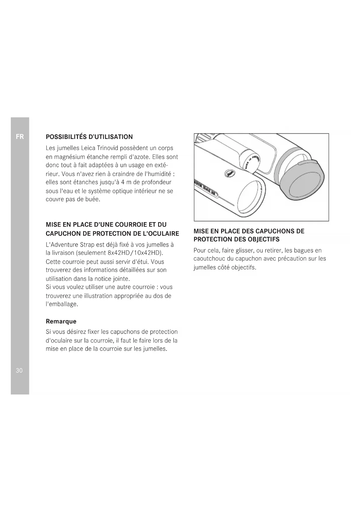 Les jumelles Leica Trinovid possèdent un corps en magnésium étanche rempli d'azote. Elles sont donc tout à fait adaptées à un usage en exté- rieur. Vous n'avez rien à craindre de l'humidité: elles sont étanches jusqu'à 4m de profondeur sous l'eau et le système optique intérieur ne se couvre pas de buée. MISE EN PLACE D'UNE COURROIE ET DU