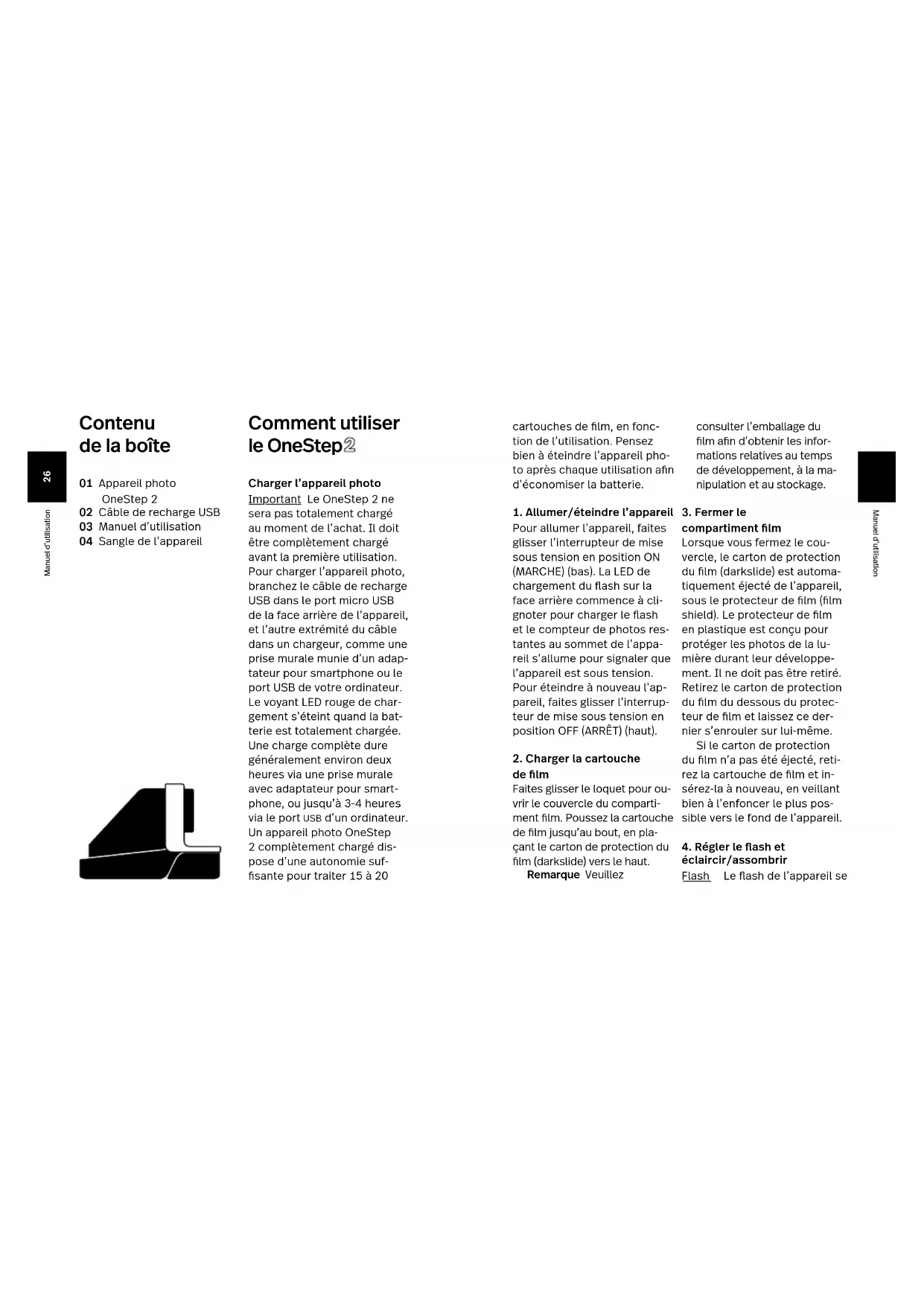 - Consult the dealer or an experienced radio/TV technician for help. Thisequipmentcomplieswith fcc radiation exposure limits set forth for an uncontrolled environment. End user must follow the specicoperatinginstructionsforsatisfying rf exposure compliance. Industry Canada (IC) This device complies with part 15 of the FCC Rule and Industry Canada license–exempt RSS standard(s). Operation is subject to the followingtwoconditions:(1)Thisdevice may not cause harmful interference, and (2) this device must accept any interference received, including interference that may cause undesired operation. Le présent appareil est conforme aux CNR d’Industrie Canada applicables aux appareils radio exempts de licence. L’exploitation est autoriséeauxdeuxconditionssuivantes:(1) l’appareil ne doit pas produire de brouillage, et (2) l’utilisateur d’appareil doit accepter toutbrouillageradioélectriquesubi, même si le brouillage est susceptible d’en compromettre le fonctionnement. The symbol means that according to local laws and regulations your product should be disposed of separately from household waste. When this product reaches its end of life, take it to a collection point designated by local authorities. Some collection points accept products for free. The separate collection and recycling of your product at the time of disposal will help conserve natural resources and ensure that it is recycled in a manner that protects human health and the environment. Garantie Vous trouverez la garantie correspondant à cet appareil photo en suivant ce lien : polaroidoriginals.com/warranty Manuel d’utilisation26 Manuel d’utilisation27 Manuel d’utilisation Comment utiliser le OneStep Charger l’appareil photo Important Le OneStep 2 ne sera pas totalement chargé au moment de l’achat. Il doit être complètement chargé avant la première utilisation. Pour charger l’appareil photo, branchez le câble de recharge USB dans le port micro USB de la face arrière de l’appareil, et l’autre extrémité du câble dans un chargeur, comme une prise murale munie d’un adap- tateur pour smartphone ou le port USB de votre ordinateur. Le voyant LED rouge de char- gements’éteintquandlabat- terie est totalement chargée. Une charge complète dure généralement environ deux heures via une prise murale avec adaptateur pour smart- phone,oujusqu’à3-4heures via le port USB d’un ordinateur. Un appareil photo OneStep 2 complètement chargé dis- pose d’une autonomie suf- santepourtraiter15à20 Contenu de la boîte 01 Appareil photo OneStep 2 02 Câble de recharge USB 03 Manuel d’utilisation 04 Sangle de l’appareil cartouchesdelm,enfonc- tion de l’utilisation. Pensez bien à éteindre l’appareil pho- toaprèschaqueutilisationan d’économiser la batterie.