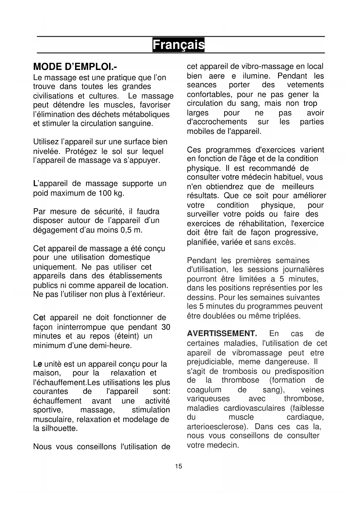 AVERTISSEMENT. En cas de certaines maladies, l'utilisation de cet apareil de vibromassage peut etre prejudiciable,meme dangereuse.II s'agit de trombosis ou predisposition de la thrombose (formation de coagulum de sang),veines variqueuses avec thrombose, maladies cardiovasculaires (faiblesse du muscle cardiaque, arterioesclerose). Dans ces cas la, nous vous conseillons de consulter notre medecin.