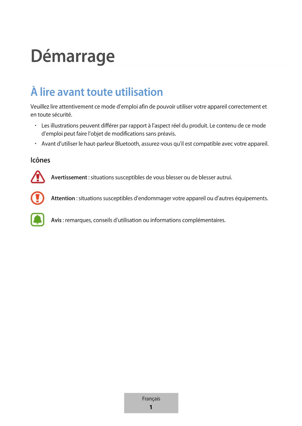 Attention : situations susceptibles d’endommager votre appareil ou d’autres équipements. Avis : remarques, conseils d’utilisation ou informations complémentaires. Français 1Démarrage