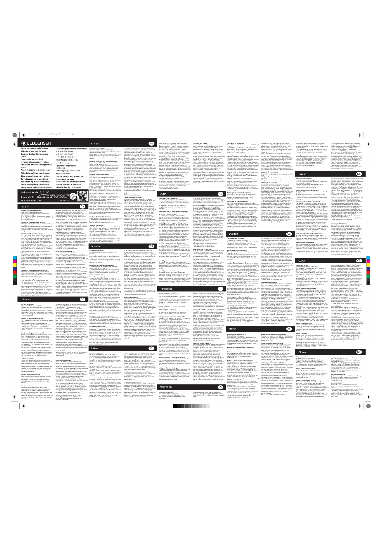- Bei Vertrieb unter Verwendung von Fernkommunika- tionsmittteln gelten die Lager- u. Versandflächen als Verkaufsfläche **In manchen Ländern unbegrenzte Anzahl. Hinweise zu den Batterien Achtung! Da Batterien eine potentielle Gefahr darstellen, müssen Sie außerhalb der Reichweite von Kindern bleiben. Gelangen Batterien, speziell Knopfzellen (z.B. durch Verschlucken), in den Körper von Personen, ist umgehend ein Arzt zu konsultieren, da dieses sonst in kürzester Zeit (< 2Std.) zu z.B. Verbrennungen, Perforation von Weichteilen und Tod führen kann. Nie Batterien und Akkus zusammen verwenden. Ob bei dem vorliegenden Produkt Batterien und/oder Akkus eingesetzt werden dürfen, ist der beiliegenden Kurzanleitung zu entnehmen. Akkus/Batterien nicht in Reichweite von Kindern aufbewahren. Akkus/Batterien nicht über 60 °C erhitzen (z. B. Sonneneinstrahlung) oder ins Feuer werfen. Akkus/Batterien dürfen keiner Nässe ausgesetzt werden. Akkus/Batterien nicht kurzschließen. Akkus nicht bei Temperaturen unter 0°C aufladen. Polarität beachten. Batterien nicht aufladen, Akkus/Batterien nicht beschädigen oder önen. Keine leeren und vollen Akkus bzw. alte und neue Batterien zusammen verwenden. Akkus/Batterien in einem Satz tauschen.Akkus nur mit geeignetem Ladegerät aufladen. Bei längerem Nichtgebrauch Akkus regelmäßig nachladen (ca. alle 3 Monate). Akkus/Batterien entsprechend den nationalen Richtlinien entsorgen. Informations sur le produit Le produit doit être utilisé comme lampe. Il est impératif de respecter ces consignes ainsi que la notice d’utilisation ci-jointe. Ne pas avaler les petites pièces contenues et les garder hors de portée des enfants. Ce produit ne peut être utilisé que selon l'usage prévu et ne convient pas aux enfants. Consignes concernant les conditions ambiantes Le produit ne peut être utilisé que dans une plage de température de -20 à +40 °C. Le produit ne doit pas être exposé durablement aux rayons directs du soleil, à de fortes vibrations, à une forte humidité et/ou à l'eau, à des solvants et des vapeurs ou être utilisé dans des atmosphères explosives. Consignes d’utilisation du produit Ne pas porter les bandeaux, dragonnes, etc. autour du cou. Ne pas utiliser le produit comme outil. Risque d’incendie et de brûlures. Le luminaire produit de la chaleur. Ne pas le couvrir, risque d’accumulation de chaleur. Si disponible, activer la sécurité de transport. Les LED de ce produit appartiennent au groupe de risque 2 selon la norme DIN EN 62471-1. Danger d’éblouissement ! Ne pas regarder directement le faisceau lumineux. Ne pas diriger le faisceau lumineux vers les yeux. Ne pas utiliser le produit pour les examens oculaires (test de la pupille). La capacité de réaction des yeux diminue sous l'influence de drogues, de médicaments, de l'alcool. Risque de lésions rétiniennes. Le produit émet une lumière bleue (400-780 nm). En cas de surchaue de la lampe/batterie, la fonction de charge peut être temporairement interrompue. Ne pas utiliser le produit avec des instruments qui focalisent la lumière. Ne pas court-circuiter les contacts du produit. Les produits contenant des aimants permanents présentent un risque pour les personnes portant un stimulateur cardiaque. Ces personnes doivent toujours respecter une distance de sécurité par rapport aux composants dotés d'un aimant permanent. En cas de non-utilisation prolongée, retirer si possible les batteries/piles du produit. Consignes d'entretien/de réparation Ne pas démonter ou modifier le produit. Les réparations et l'entretien ne doivent être eectués que par un personnel spécialisé et autorisé. Service après-vente et plus d’informations: www.ledlenser.com. Consignes d’élimination La poubelle barrée d’une croix indique que l’élimination séparée des déchets ménagers est prescrite par la loi. Les appareils et batteries contiennent d’une part des matières premières précieuses mais peuvent également contenir des substances nocives. Une élimination séparée évite de mettre en danger l'environnement et la santé tout en contribuant à préserver les ressources en recyclant les matières premières. Vous pouvez le faire gratuitement dans un commerce ou un point de collecte près de chez vous. Tous les distributeurs dont la surface de vente d’appareils électriques est ≥ 400 m² (ou dont la surface de vente totale* est ≥ 800 m² et qui proposent des appareils électriques en plus des denrées alimentaires plusieurs fois par année civile ou en permanence) sont tenus de reprendre gratuitement, directement ou à proximité, un appareil usagé (même type d’appareil ayant essentiellement les mêmes fonctions). Jusqu’à 3** appareils usagés (max. 25 x 25 x 25 cm) par type d'appareil peuvent être retournés gratuitement, même sans achat préalable, dans un commerce de détail ou auprès d'un système de collecte local. L’utilisation de batteries rechargeables ou à longue durée de vie peut contribuer à la réduction des déchets. Il convient d’être particulièrement prudent lors de la manipulation de batteries contenant du lithium en raison des risques particuliers qu’elles présentent. Si les piles ou les batteries contiennent du mercure (Hg), du cadmium (Cd) ou du plomb (Pb), vous trouverez le symbole chimique correspondant sous le symbole de la poubelle barrée. Avant de les éliminer, il convient d’envisager leur recyclage ou leur retraitement. Chaque utilisateur final est responsable de la suppression des données à caractère personnel sur les anciens appareils. Si cela est possible sans les détruire, retirer auparavant avec précaution les éléments déchargés (piles/batteries) conformément au mode d'emploi et les éliminer séparément. Pour plus d’informations, voir www.ledlenser.com/disposal.