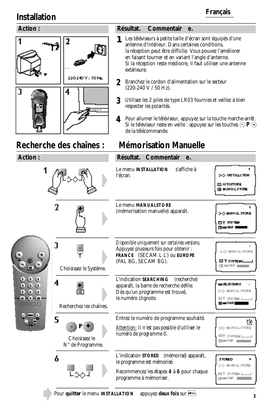 Pour allumer le téléviseur, appuyez sur la touche marche-arrêt. Si le téléviseur reste en veille : appuyez sur les touches de la télécommande. Recherche des chaînes : Mémorisation Manuelle Action : Résultat. Commentair e. Le menu INSTALLATION l'écran. s'affiche à Le menu MANUALSTORE (mémorisation manuelle) apparaît. Disponible uniquement sur certaines versions. Appuyez plusieurs fois pour obtenir : FRANCE (SECAM L L’) ou EUROPE (PAL BG, SECAM BG). Choisissez le Système. L’indication SEARCHING (recherche) apparaît, la barre de recherche défile. Dès qu'un programme est trouvé, le numéro clignote. Recherchez les chaînes. Entrez le numéro de programme souhaité. Choisissez le N° de Programme. Attention: Il n’est pas possible d’utiliser le numéro de programme 0. L'indication STORED (mémorisé) apparaît, le programme est mémorisé. Recommencez les étapes 4 à 6 pour chaque programme à mémoriser. Pour quitter le menu INSTALLATION appuyez deux fois sur