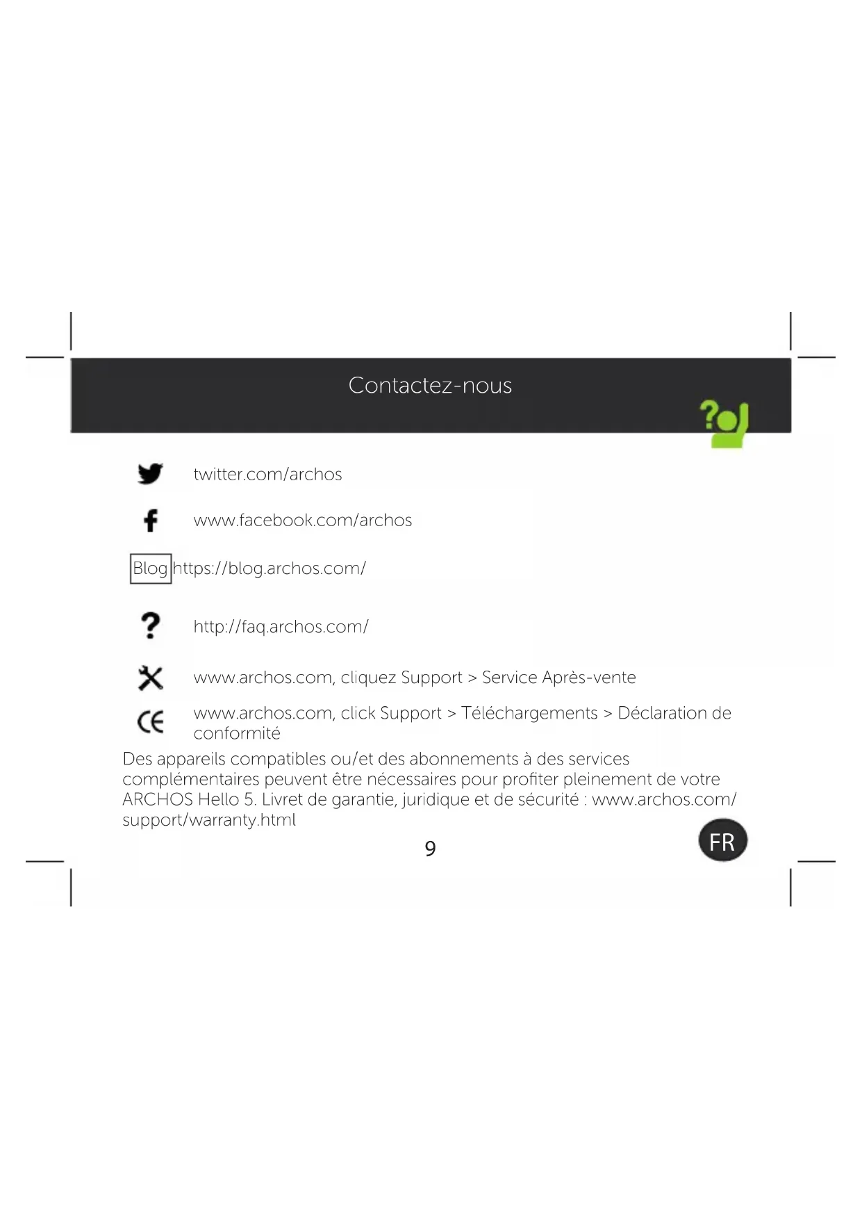 Contactez-nous twitter.com/archos www.facebook.com/archos Blog https://blog.archos.com/ http://faq.archos.com/ www.archos.com, cliquez Support > Service Après-vente www.archos.com, click Support > Téléchargements > Déclaration de conformité Des appareils compatibles ou/et des abonnements à des services complémentaires peuvent être nécessaires pour profiter pleinement de votre ARCHOS Hello 5. Livret de garantie, juridique et de sécurité : www.archos.com/ support/warranty.html10