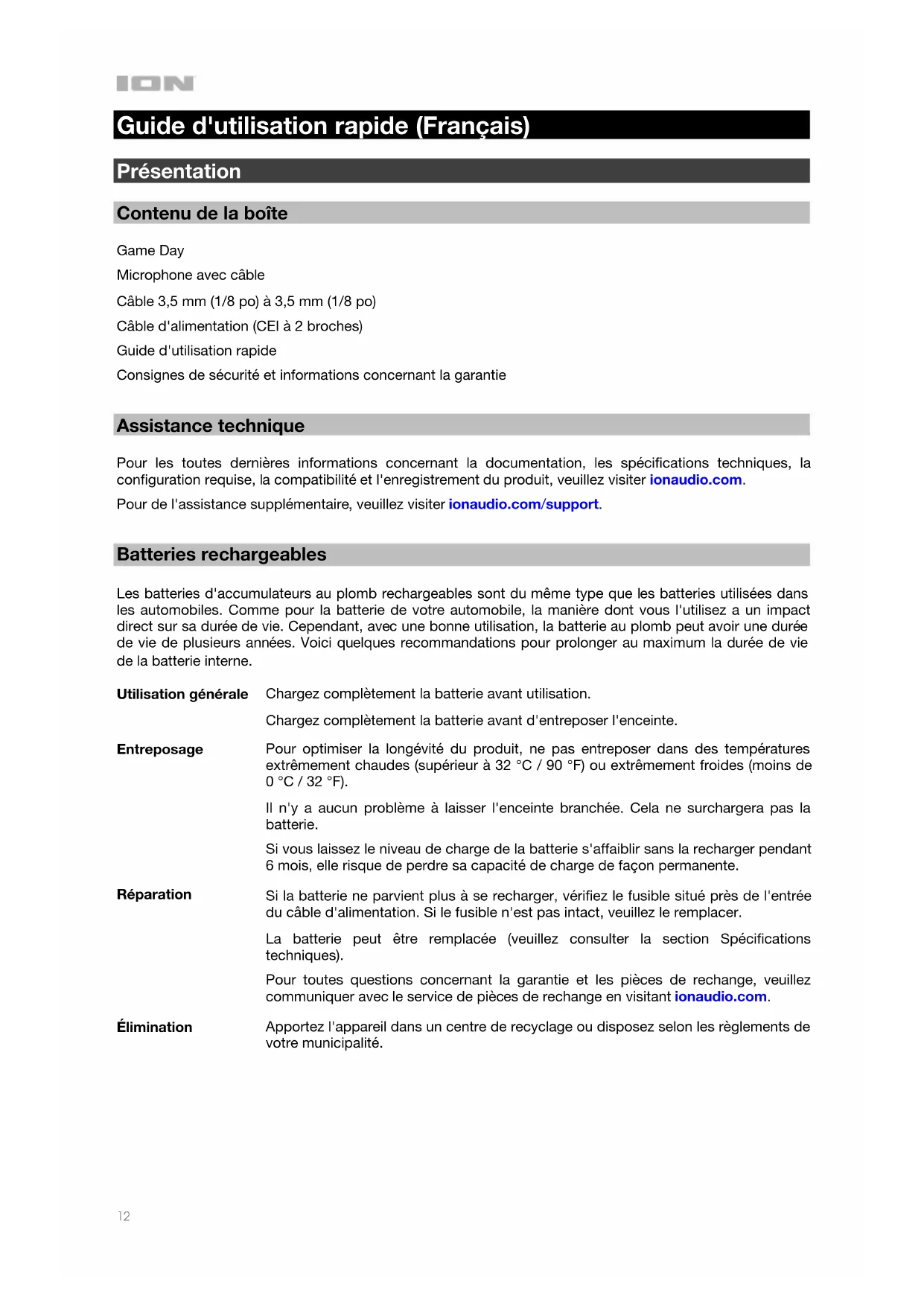 Guide d'utilisation rapide (Français) Présentation Contenu de la boîte Game Day Microphone avec câble Câble 3,5 mm (1/8 po) à 3,5 mm (1/8 po) Câble d'alimentation (CEI à 2 broches) Guide d'utilisation rapide Consignes de sécurité et informations concernant la garantie Assistance technique Pour les toutes dernières informations concernant la documentation, les spécifications techniques, la configuration requise, la compatibilité et l'enregistrement du produit, veuillez visiter ionaudio.com. Pour de l'assistance supplémentaire, veuillez visiter ionaudio.com/support. Batteries rechargeables Les batteries d'accumulateurs au plomb rechargeables sont du même type que les batteries utilisées dans les automobiles. Comme pour la batterie de votre automobile, la manière dont vous l'utilisez a un impact direct sur sa durée de vie. Cependant, avec une bonne utilisation, la batterie au plomb peut avoir une durée de vie de plusieurs années. Voici quelques recommandations pour prolonger au maximum la durée de vie de la batterie interne. Utilisation générale Chargez complètement la batterie avant utilisation.Chargez complètement la batterie avant d'entreposer l'enceinte. Entreposage Pour optimiser la longévité du produit, ne pas entreposer dans des températures extrêmement chaudes (supérieur à 32 °C / 90 °F) ou extrêmement froides (moins de 0 °C / 32 °F). Il n'y a aucun problème à laisser l'enceinte branchée. Cela ne surchargera pas la batterie. Si vous laissez le niveau de charge de la batterie s'affaiblir sans la recharger pendant 6 mois, elle risque de perdre sa capacité de charge de façon permanente. Réparation Si la batterie ne parvient plus à se recharger, vérifiez le fusible situé près de l'entrée du câble d'alimentation. Si le fusible n'est pas intact, veuillez le remplacer. La batterie peut être remplacée (veuillez consulter la section Spécifications techniques). Pour toutes questions concernant la garantie et les pièces de rechange, veuillez communiquer avec le service de pièces de rechange en visitant ionaudio.com. Élimination Apportez l'appareil dans un centre de recyclage ou disposez selon les règlements de votre municipalité.13