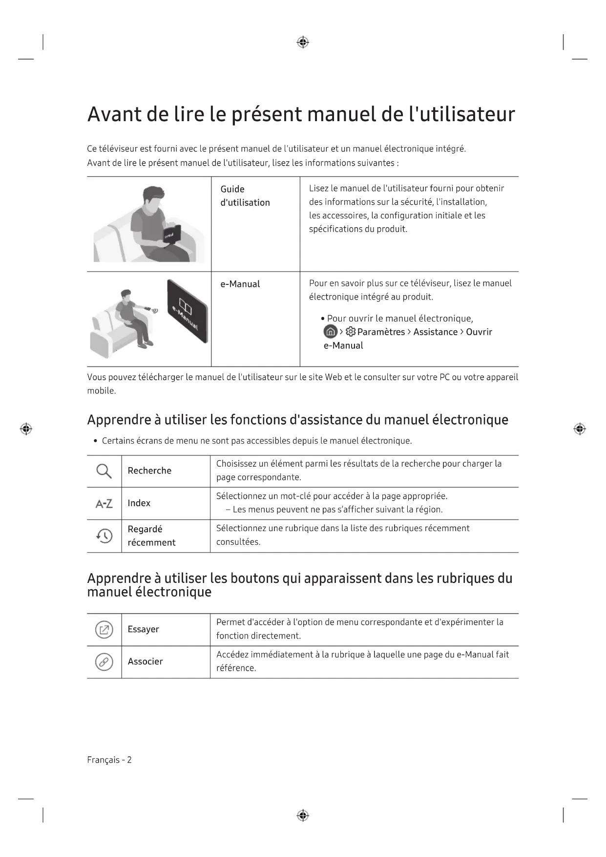 - Certains écrans de menu ne sont pas accessibles depuis le manuel électronique. Recherche Choisissez un élément parmi les résultats de la recherche pour charger la page correspondante. Index Sélectionnez un mot-clé pour accéder à la page appropriée. – Les menus peuvent ne pas s’afficher suivant la région. Regardé récemment Sélectionnez une rubrique dans la liste des rubriques récemment consultées. Apprendre à utiliser les boutons qui apparaissent dans les rubriques du manuel électronique Essayer Permet d'accéder à l'option de menu correspondante et d'expérimenter la fonction directement. Associer Accédez immédiatement à la rubrique à laquelle une page du e-Manual fait référence. Français Français - 2Avertissement! Consignes de sécurité importantes Veuillez lire les consignes de sécurité avant d'utiliser le téléviseur. ATTENTION Produit de classeII: Ce symbole indique qu'aucun raccordement de sécurité à la terre (prise de terre) n'est requis. RISQUE DE CHOC ÉLECTRIQUE.NE PAS OUVRIR.