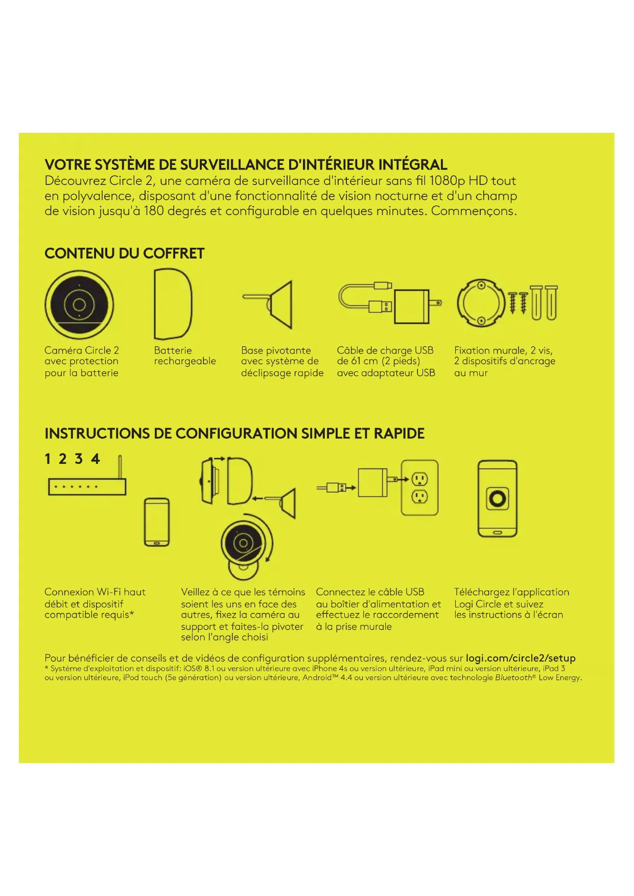Connexion Wi-Fi haut débit et dispositif compatible requis* Veillez à ce que les témoins soient les uns en face des autres, xez la caméra au support et faites-la pivoter selon l'angle choisi Connectez le câble USB au boîtier d'alimentation et eectuez le raccordement à la prise murale Téléchargez l'application Logi Circle et suivez les instructions à l'écran Pour bénécier de conseils et de vidéos de conguration supplémentaires, rendez-vous sur logi.com/circle2/setup *Système d'exploitation et dispositif: iOS®8.1 ou version ultérieure avec iPhone4s ou version ultérieure, iPadmini ou version ultérieure, iPad3 ouversion ultérieure, iPodtouch (5egénération) ou version ultérieure, Android™4.4 ou version ultérieure avec technologie Bluetooth