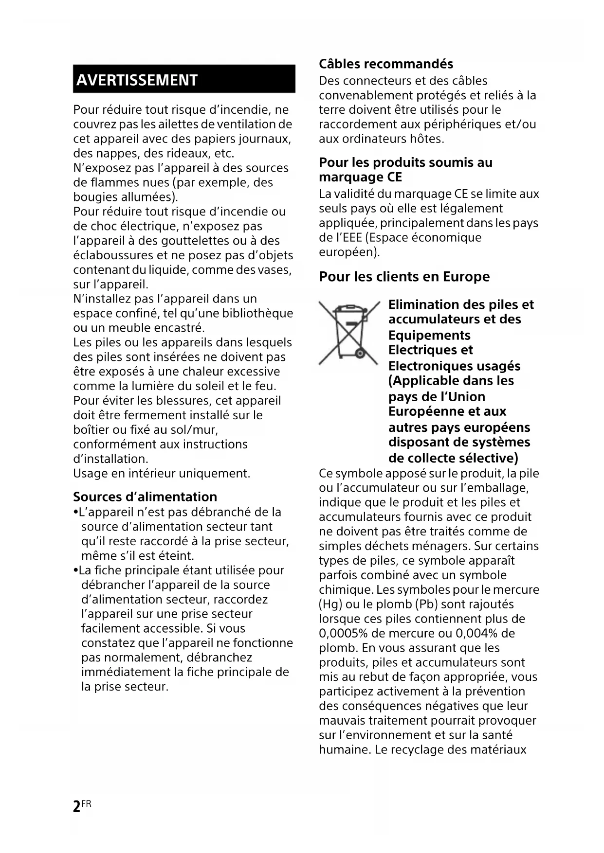 contribue par ailleurs à la preservation des ressources naturelles. Pour les produits qui pour des raisons de sécurité, de performance ou d'intégrité de données nécessitent une connexion permanente à une pile ou à un accumulator, il convendra de vous rapprocher d'un Service Technique qualifié pour effectuer son remplacement. En rapportant votre apparéil électrique, les piles et accumulateurs en fin de vie à un point de collecte approprié vous vous assurez que le produit, la pile ou l'accumulateur incorpore sera traité correctement. Pour tous les autres cas de figure et afin d'enlever les piles ou accumulateurs en toute sécurité de votre apparéil, reportez-vous au manuel d'utilisation. Rapportez les piles et accumulateurs, et les équipements électriques etlectroniques usages au point de collecte approprié pour le recyclage. Pour toute information complémentaire au sujet du recyclage de ce produit ou des piles et accumulateurs, vous pouvez contacter votre municipalité, votre déchetterie locale ou le point de vente où vous avez acheté ce produit.