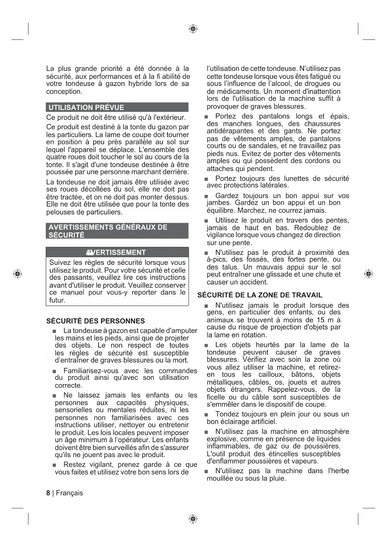 Ce produit ne doit être utilisé qu'à l'extérieur. Ce produit est destiné à la tonte du gazon par les particuliers. La lame de coupe doit tourner en position à peu près parallèle au sol sur lequel l'appareil se déplace. L'ensemble des quatre roues doit toucher le sol au cours de la tonte. Il s'agit d'une tondeuse destinée à être poussée par une personne marchant derrière. La tondeuse ne doit jamais être utilisée avec ses roues décollées du sol, elle ne doit pas être tractée, et on ne doit pas monter dessus. Elle ne doit être utilisée que pour la tonte des pelouses de particuliers.